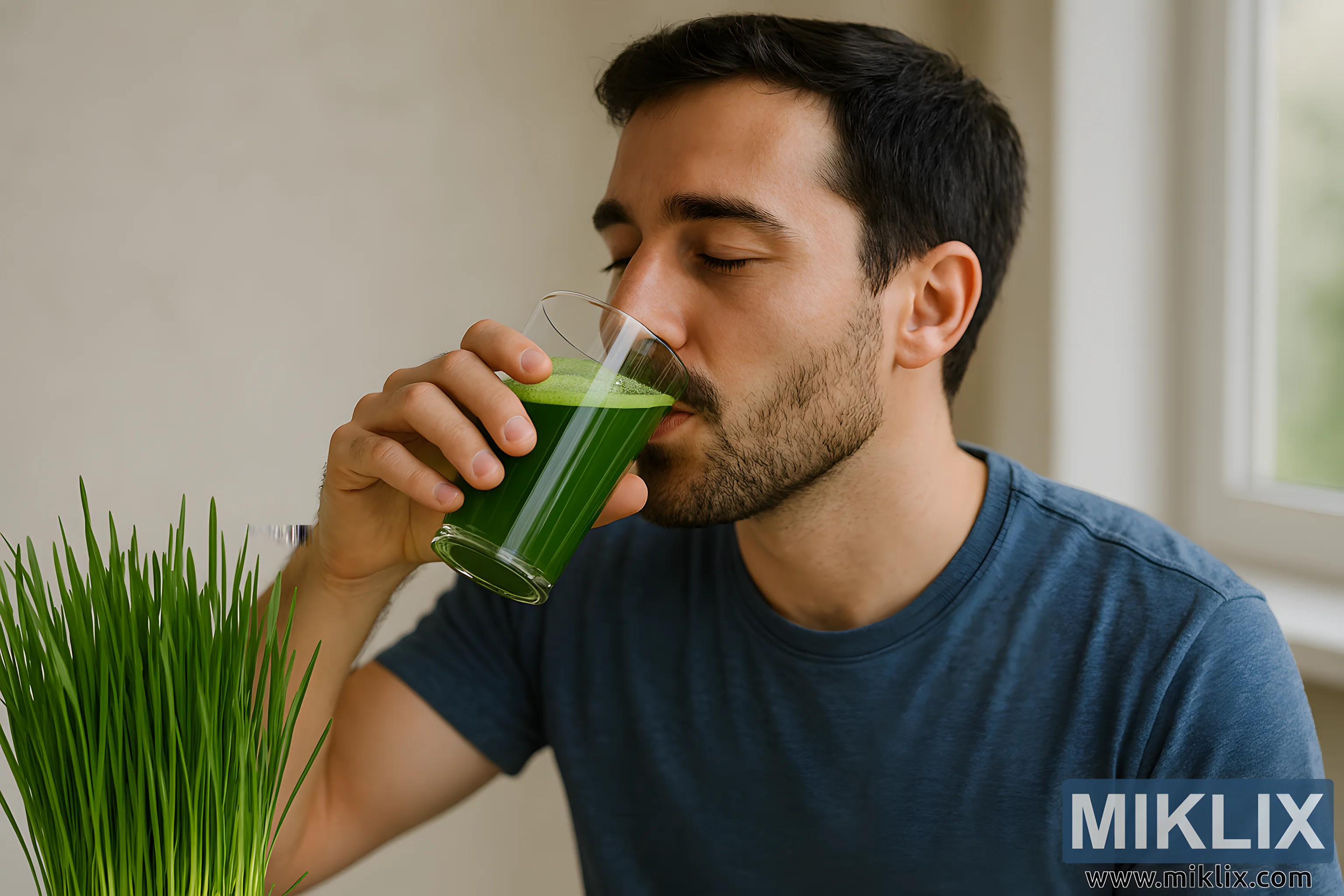 A serene scene of a man savoring fresh wheatgrass juice in natural light, highlighting wellness and tranquility.