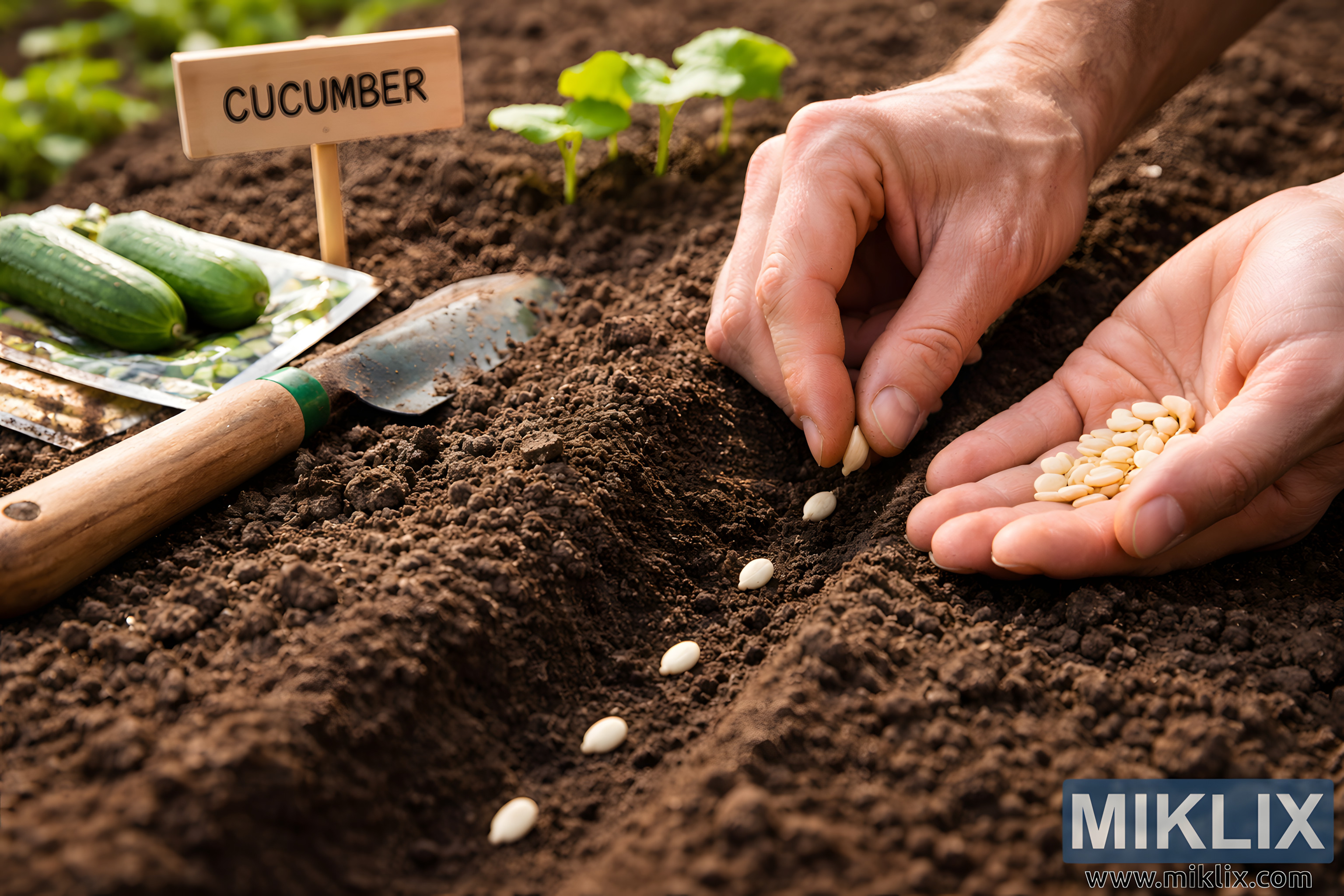 Close-up photo of hands sowing cucumber seeds in prepared soil, illustrating proper spacing, gardening tools, and early plant growth