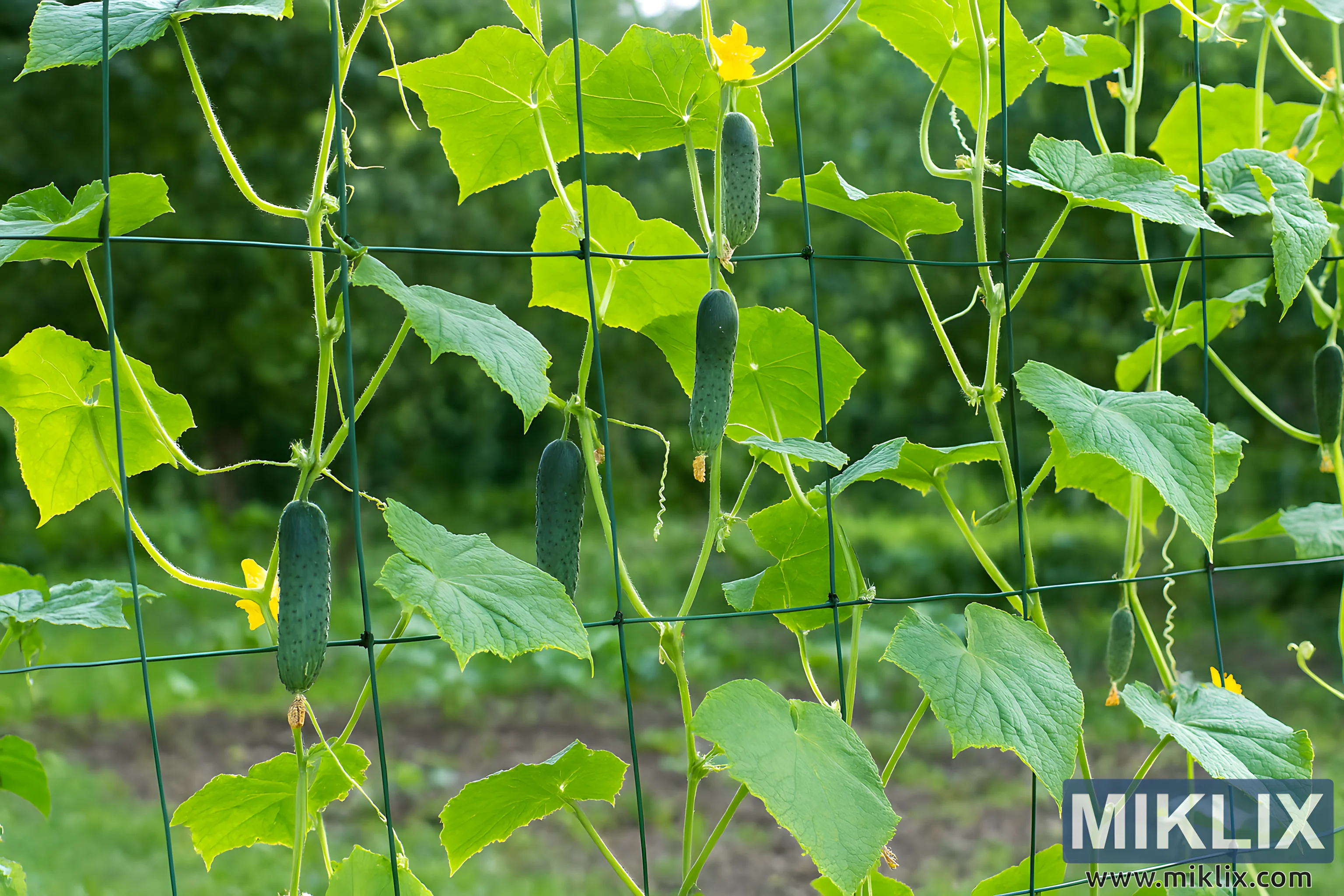 High-resolution image of cucumber plants growing vertically on a trellis system in a vibrant garden, showcasing healthy leaves, flowers, and maturing cucumbers.