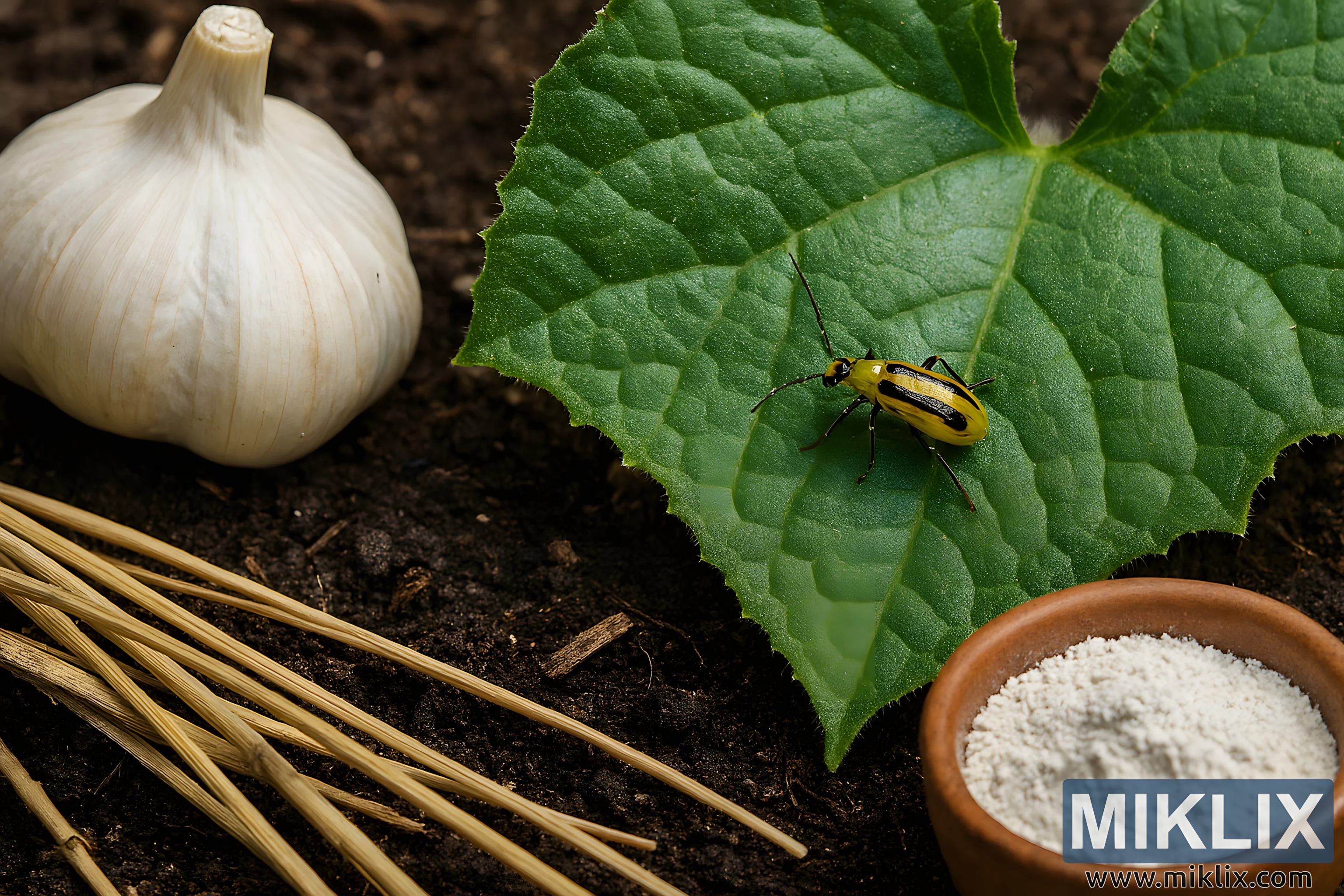 High-resolution image of a striped cucumber beetle on a cucumber leaf, featuring organic pest control methods like garlic, diatomaceous earth, and straw mulch.
