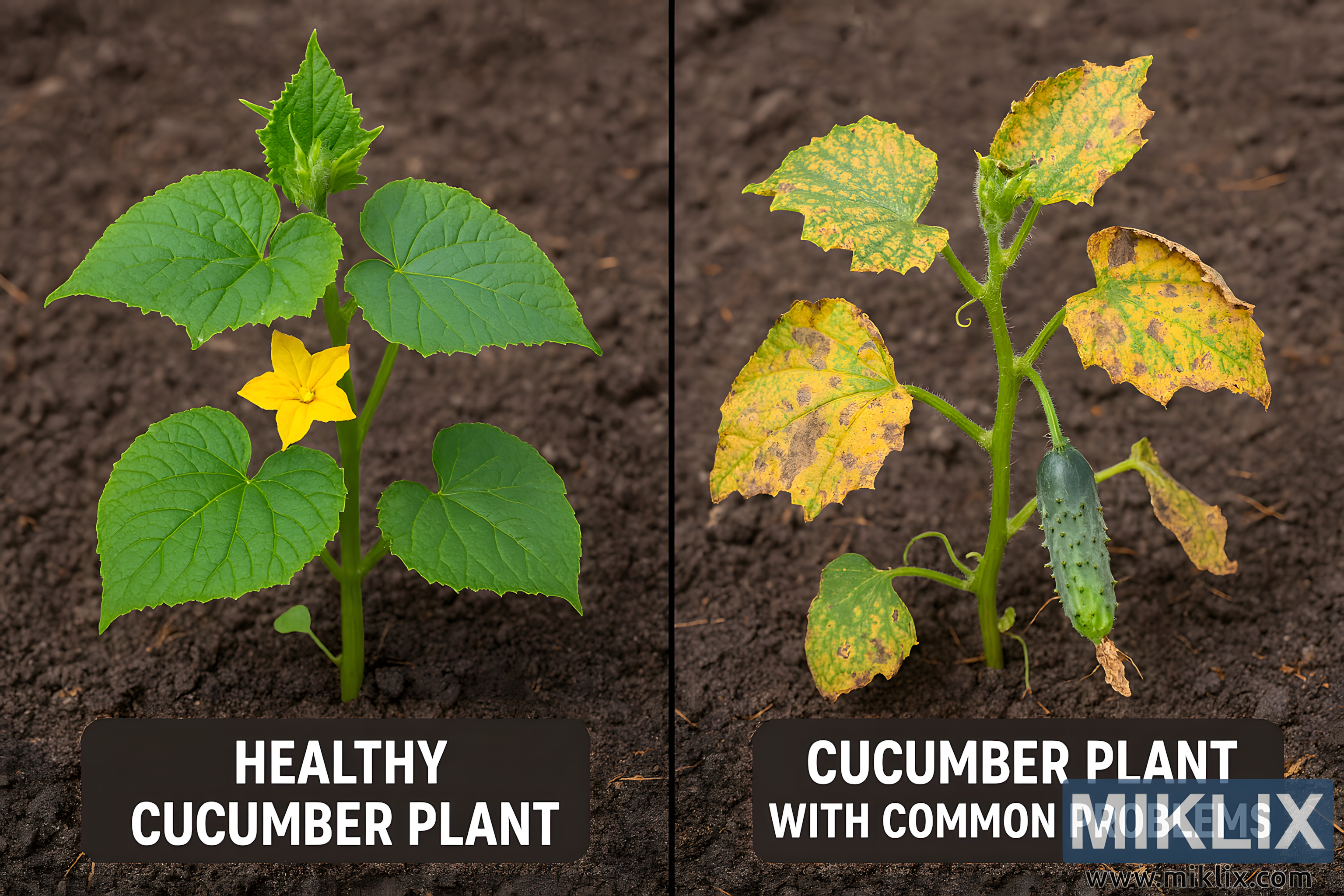 A high-resolution landscape photograph presents a side-by-side comparison of two cucumber plants growing in a garden bed, designed to highlight the visual differences between healthy growth and common plant problems.