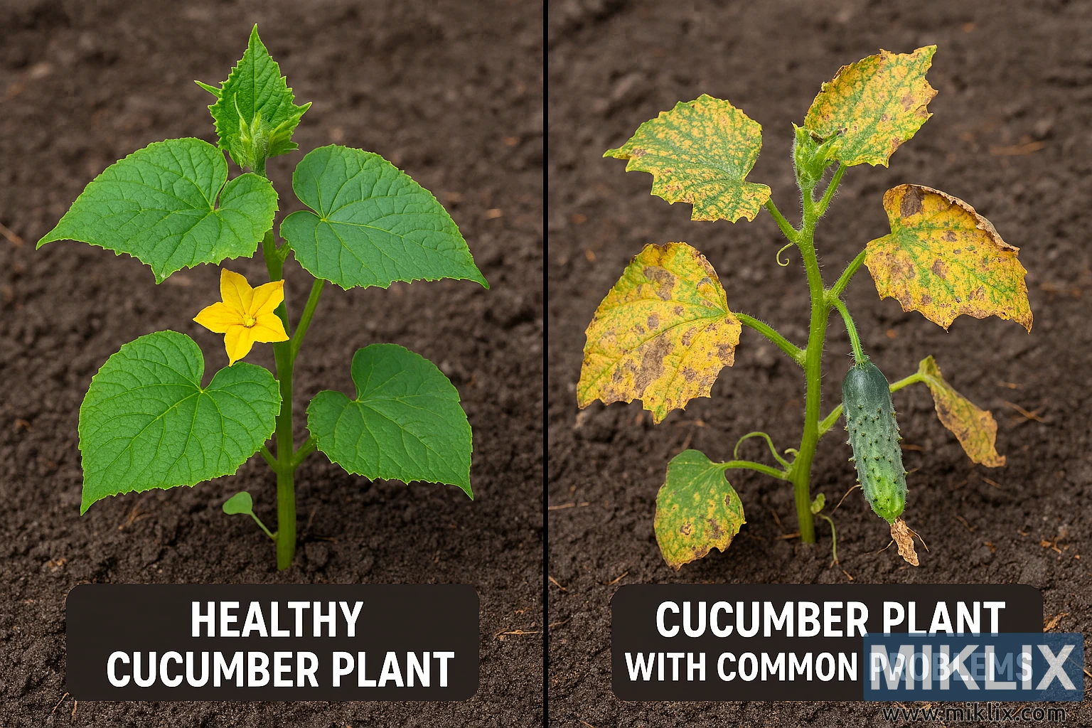 Educational landscape image comparing a healthy cucumber plant with one showing common problems like yellowing, leaf damage, and poor fruit development. Ideal for gardening guides and catalogs.