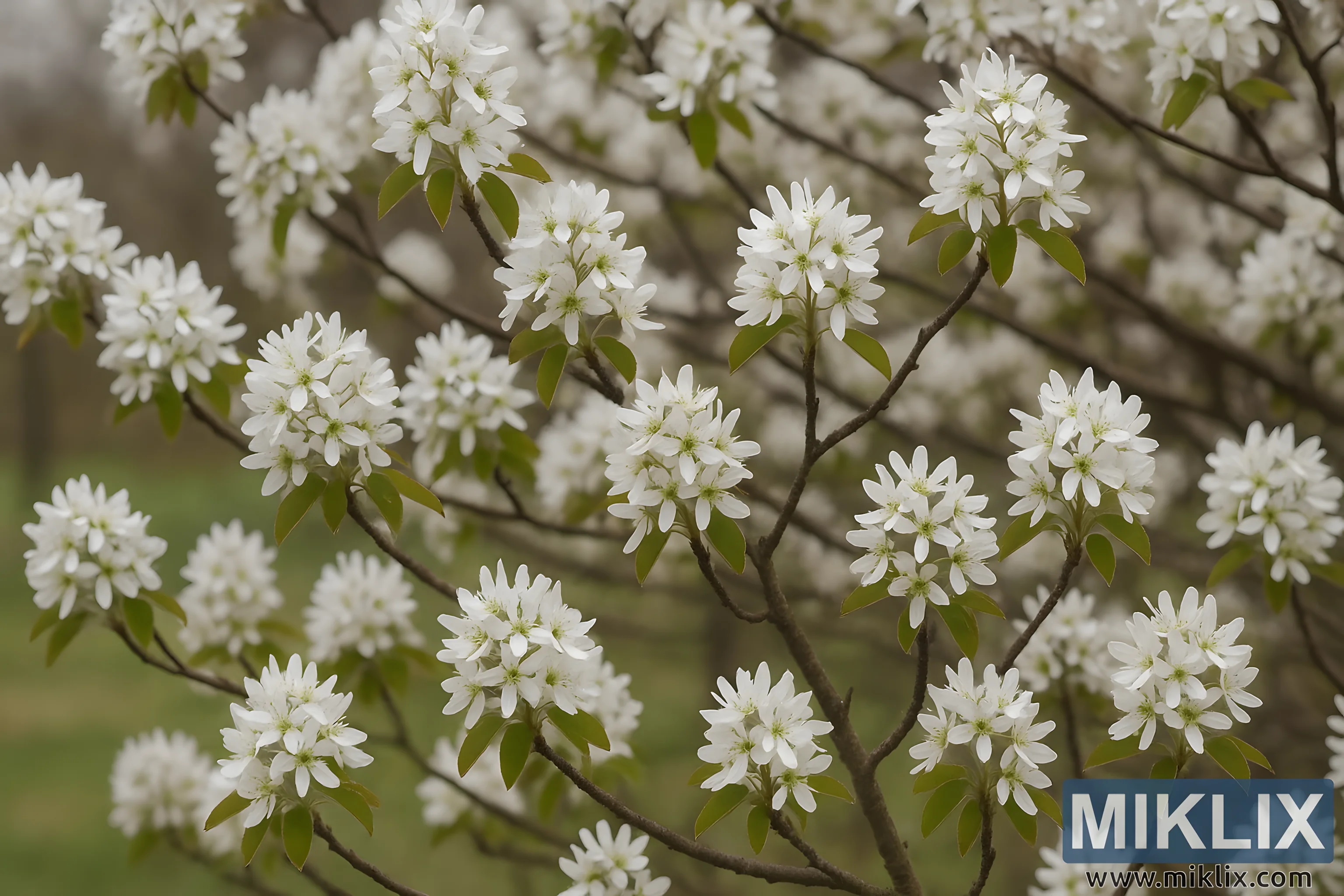 A beautiful landscape photo of a serviceberry tree in early spring, showcasing clusters of white flowers and young green leaves against a softly blurred natural background.