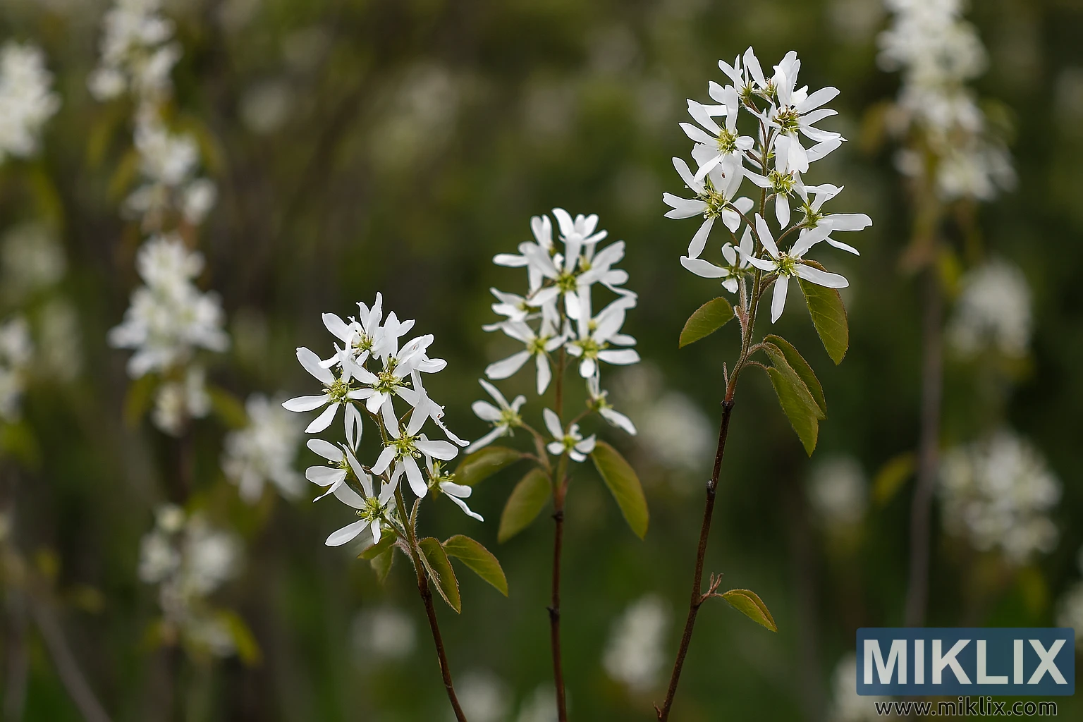 The background of the image is softly blurred, employing a shallow depth of field that emphasizes the sharpness and clarity of the foreground flowers. This bokeh effect transforms the surrounding greenery and additional flower clusters into a painterly wash of greens and whites, ranging from deep forest tones to lighter, almost yellowish hues. The blurred backdrop not only provides depth but also enhances the perception of space, making the Serviceberry blossoms appear as though they are gently emerging from a lush, living canvas.