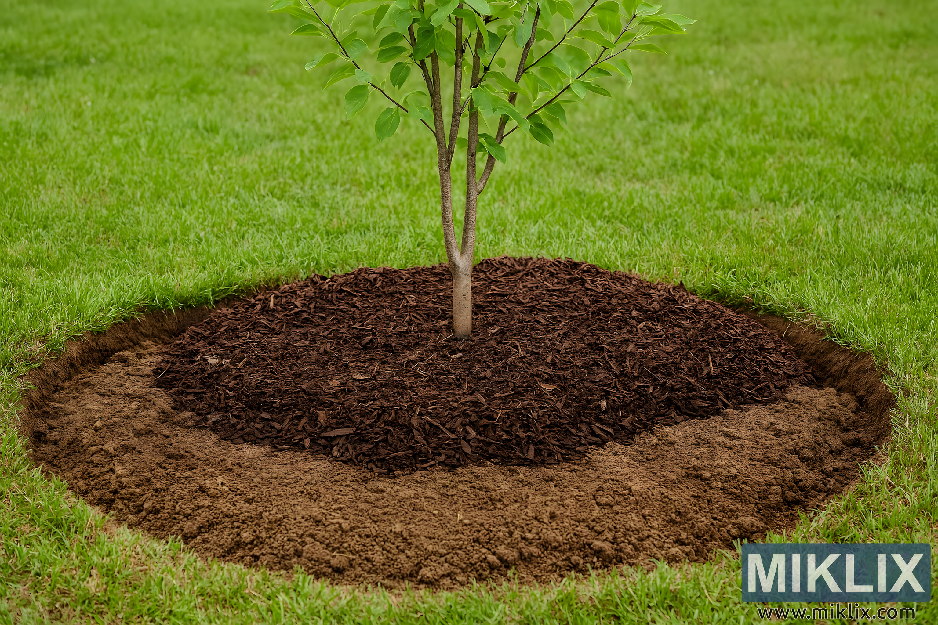 Around the base of the tree, a thick, even layer of organic mulch has been applied. The mulch consists of irregularly shaped wood chips in varying shades of dark brown, spread to a depth of approximately 2–3 inches. Importantly, the mulch is arranged in a neat circular ring that extends beyond the planting hole, creating a smooth transition between the disturbed soil and the surrounding grass. A small gap has been intentionally left between the mulch and the tree trunk, preventing moisture buildup and reducing the risk of rot or pest damage. This detail underscores the correct mulching technique, which protects the soil from drying out, suppresses weed growth, and moderates soil temperature while safeguarding the tree’s health.