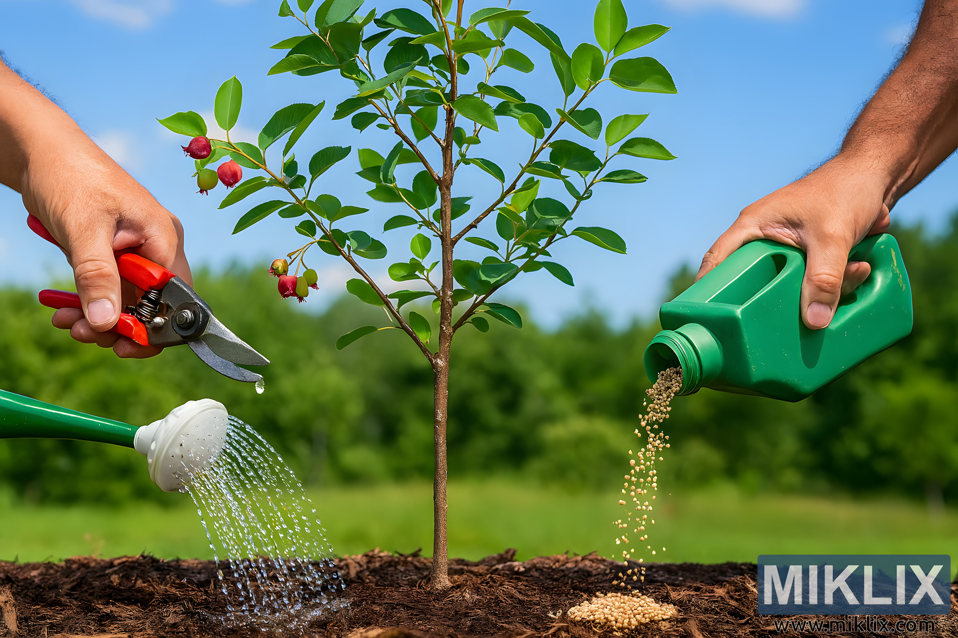 The image presents a vivid, high-resolution landscape scene that captures the essence of seasonal care for a young serviceberry tree (Amelanchier spp.) in a natural garden setting. The tree, positioned slightly off-center, stands with a slender, textured trunk and branches adorned with ovate, serrated green leaves and clusters of ripening berries in shades of red and green. The ground beneath the tree is carefully mulched with dark brown organic material, creating a neat and nourished base. The gardener’s hands are actively engaged in three essential tasks that represent the seasonal cycle of tree care: pruning, watering, and fertilizing. On the left, one hand wields red-handled pruning shears, poised to trim a small branch bearing berries, demonstrating the importance of shaping the tree and encouraging healthy growth. On the right, the gardener’s other hand pours granular fertilizer from a green plastic container, the beige and light-brown granules scattering onto the mulch at the tree’s base, symbolizing the replenishment of nutrients needed for robust development. Simultaneously, a green watering can with a white perforated spout releases a steady stream of water, soaking the mulch and ensuring hydration reaches the roots. The interplay of these three actions—cutting, feeding, and watering—illustrates the holistic approach to seasonal tree care. The background features a lush, layered landscape of trees and shrubs in varying shades of green, with a bright blue sky and wispy clouds overhead, enhancing the sense of vitality and growth. Sunlight filters across the scene, casting soft shadows that highlight the textures of bark, leaves, mulch, and water droplets. The composition emphasizes both the practical techniques of tree care and the harmony between human effort and natural cycles. Every detail, from the sheen of the pruning blades to the glistening droplets rebounding from the mulch, contributes to a dynamic portrayal of stewardship and seasonal rhythm. This image not only documents the physical tasks of pruning, watering, and fertilizing but also conveys the broader theme of nurturing and sustaining life through attentive, seasonal care practices. It serves as both an instructional and inspirational representation of how gardeners can support the health and productivity of serviceberry trees throughout the year, ensuring their continued beauty, fruiting, and ecological contribution to the landscape.