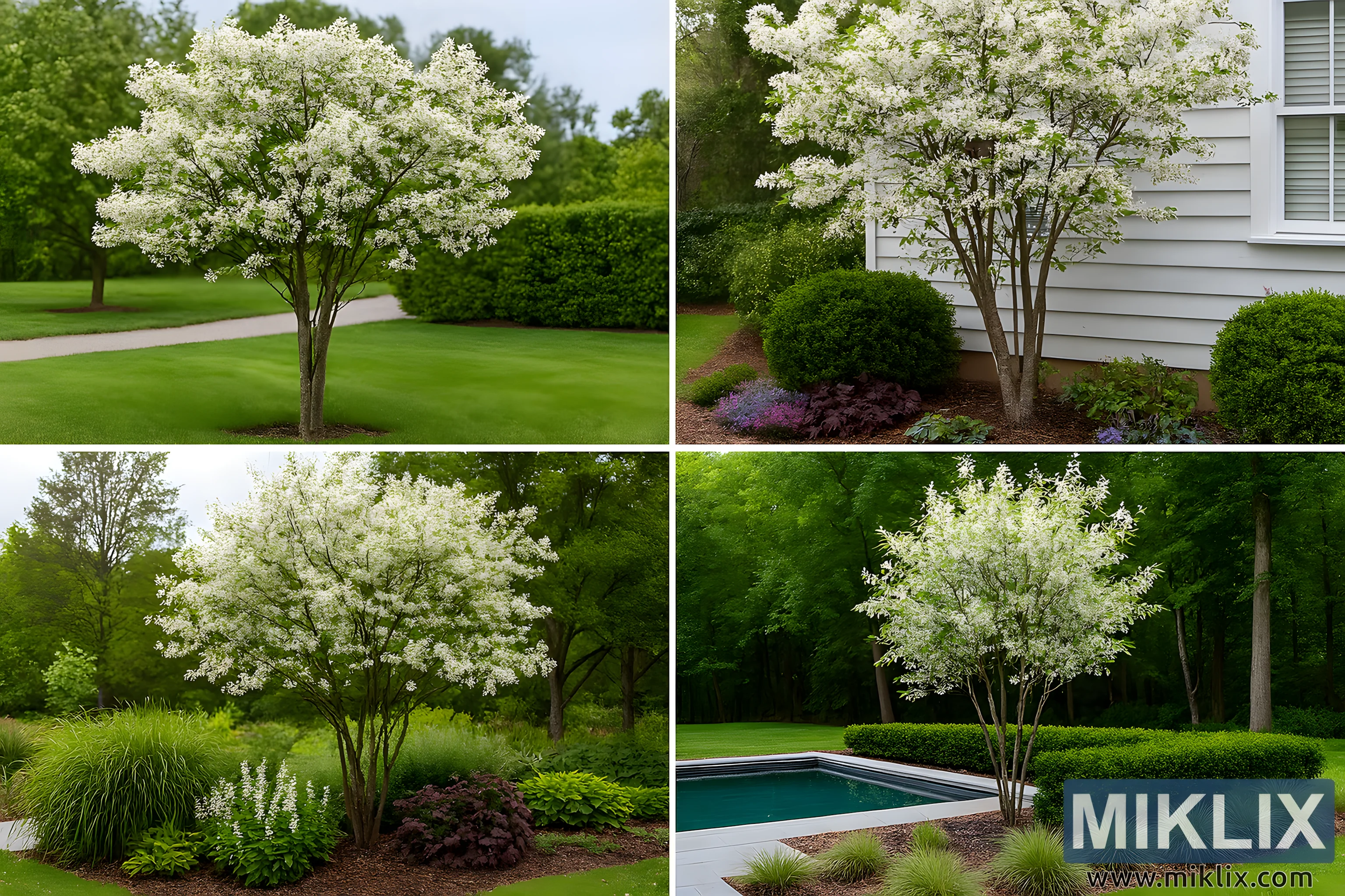 Across all four vignettes, the serviceberry functions as a unifying element: a spring-blooming anchor that pairs readily with lawns, hedges, mixed borders, foundation plantings, and formal pool terraces. The white flowers provide a seasonal crescendo, but the tree’s subtle bark color and branching habit ensure year-round presence. Together, these settings showcase how serviceberries can be leveraged as focal points, transitional accents, and textural counterpoints—equally at home in classic gardens and modern landscapes.