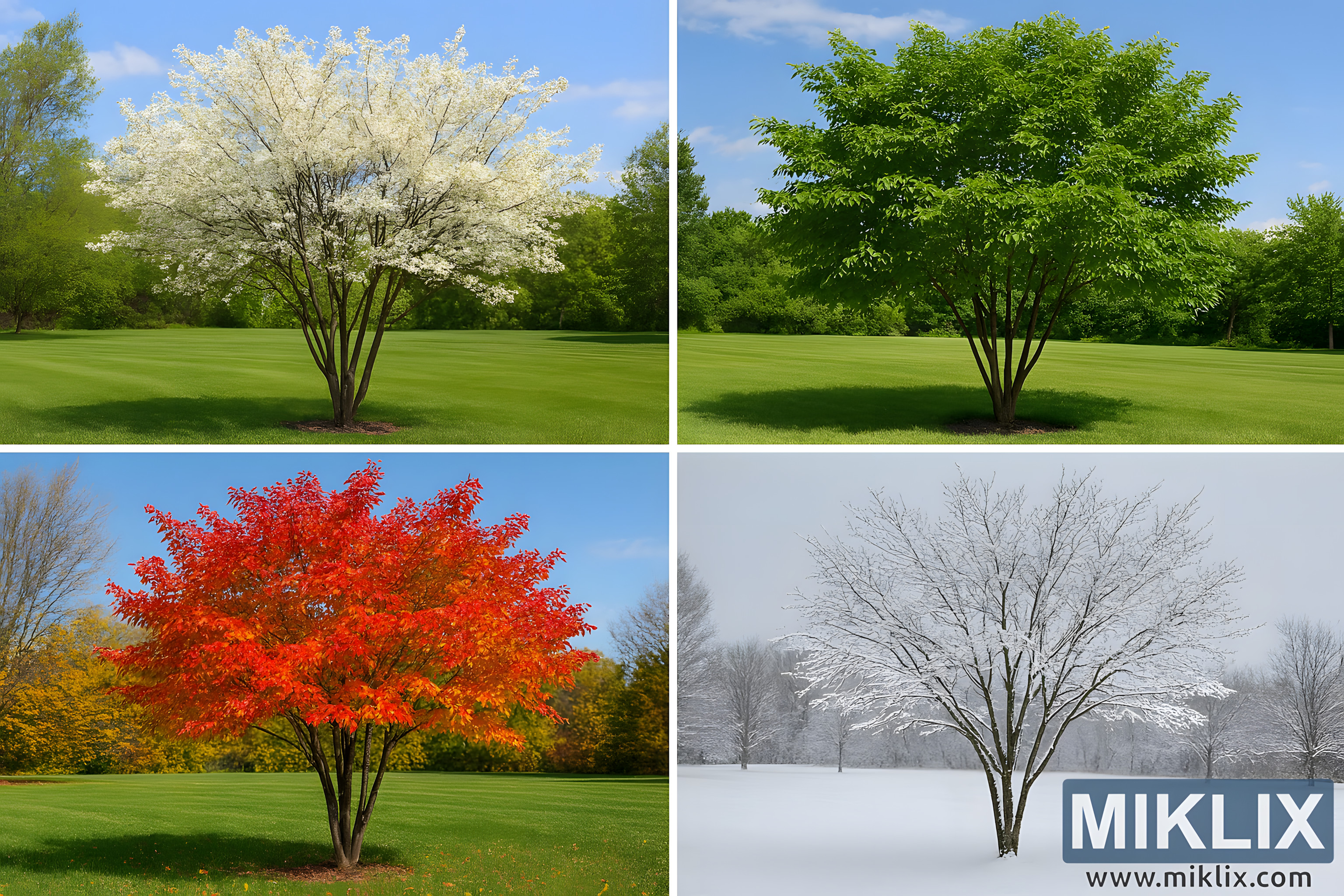 Explore the year-round beauty of a Serviceberry tree with this four-season image, showcasing spring blossoms, lush summer leaves, vibrant autumn colors, and a serene winter silhouette.