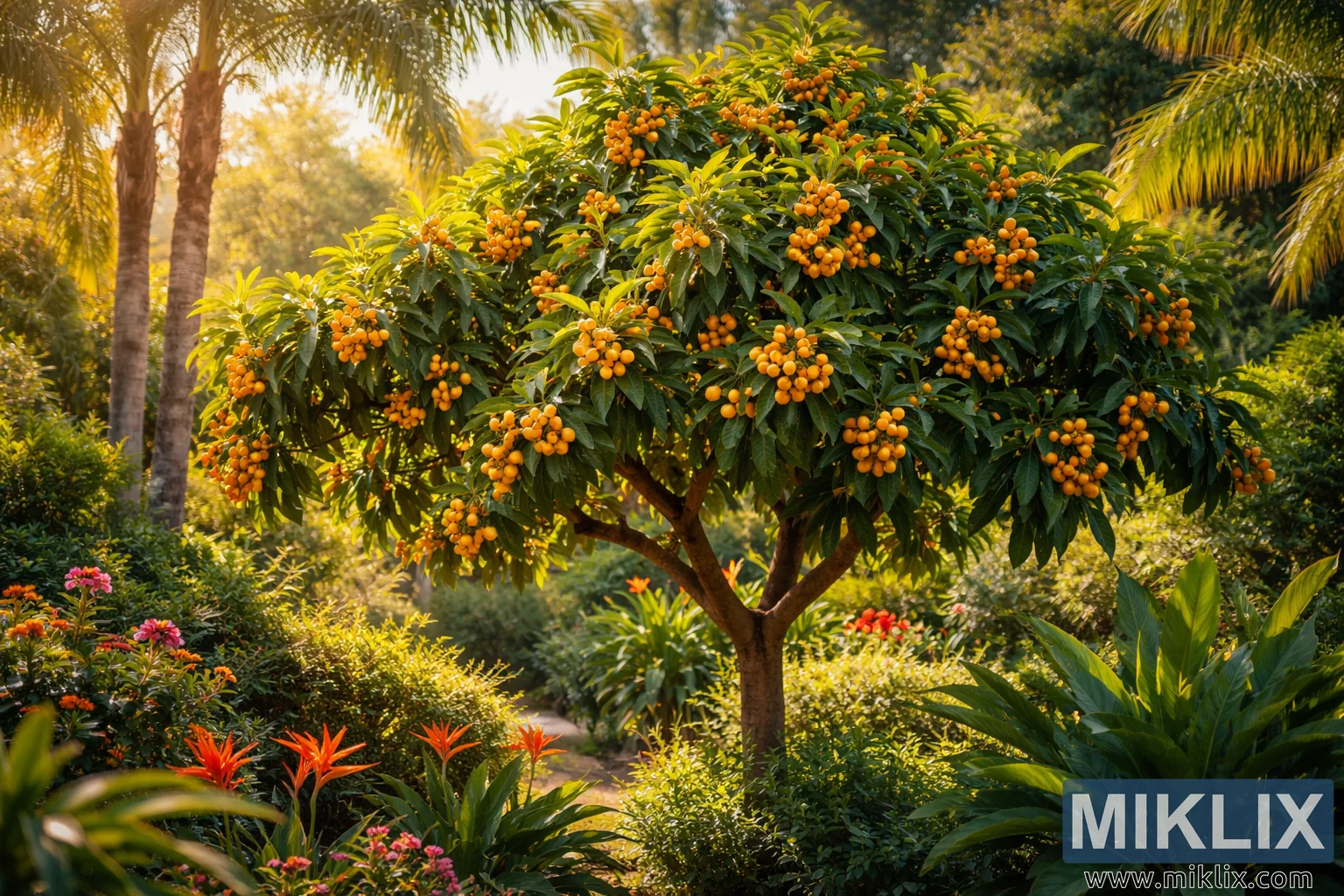 Surrounding the tree is a lush, densely planted garden typical of a subtropical climate. In the background, tall palm trees rise above the scene, their fronds catching the sunlight and swaying lightly in the warm air. Beneath them grows a rich layer of ornamental foliage and flowering plants. Bright orange and red tropical flowers appear in clusters near the ground, adding vibrant bursts of color that complement the warm tones of the loquat fruit.