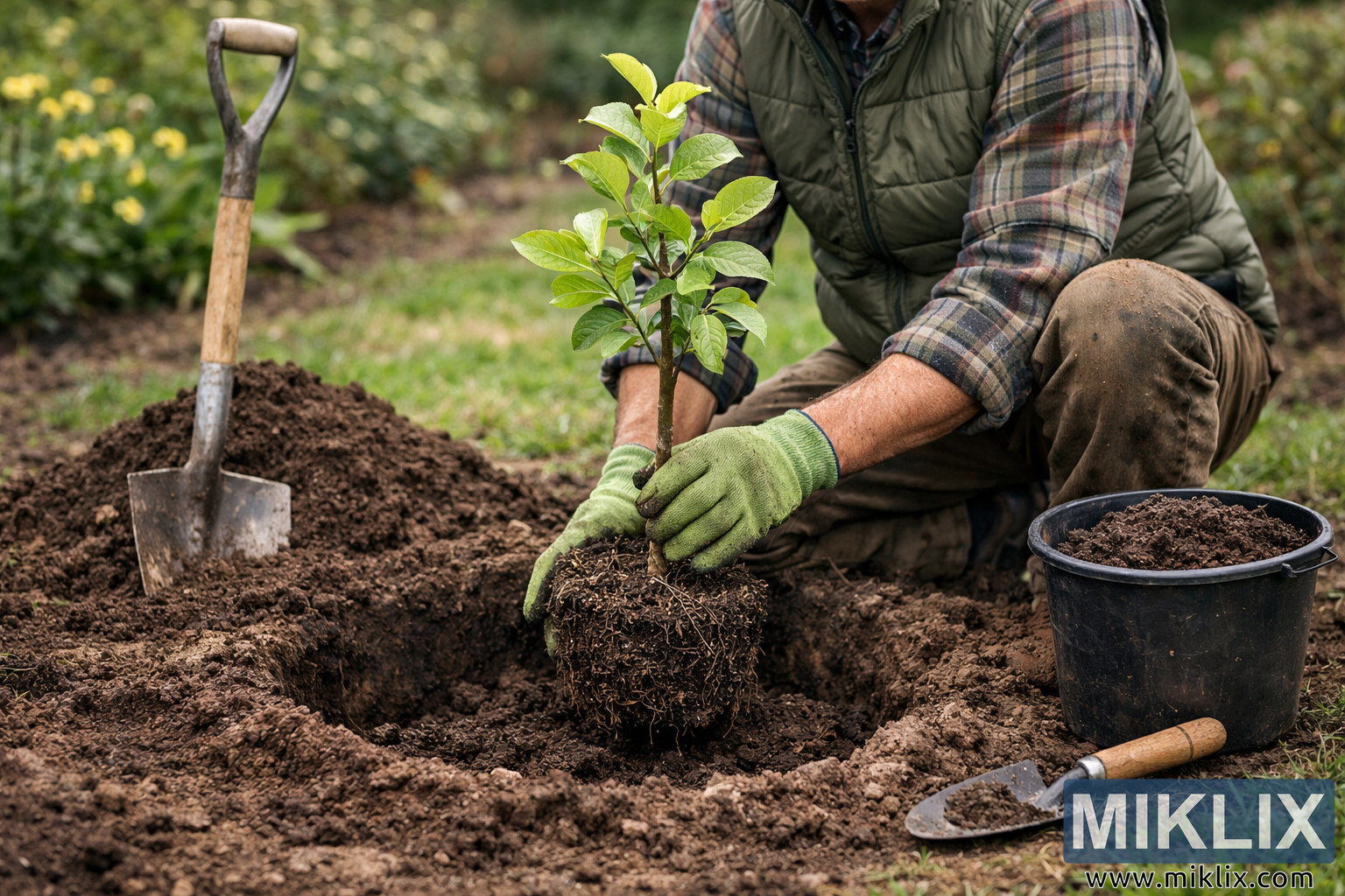 High-resolution landscape photo of a gardener planting a young quince tree in a freshly prepared hole, surrounded by garden tools, dark soil, and vibrant greenery.