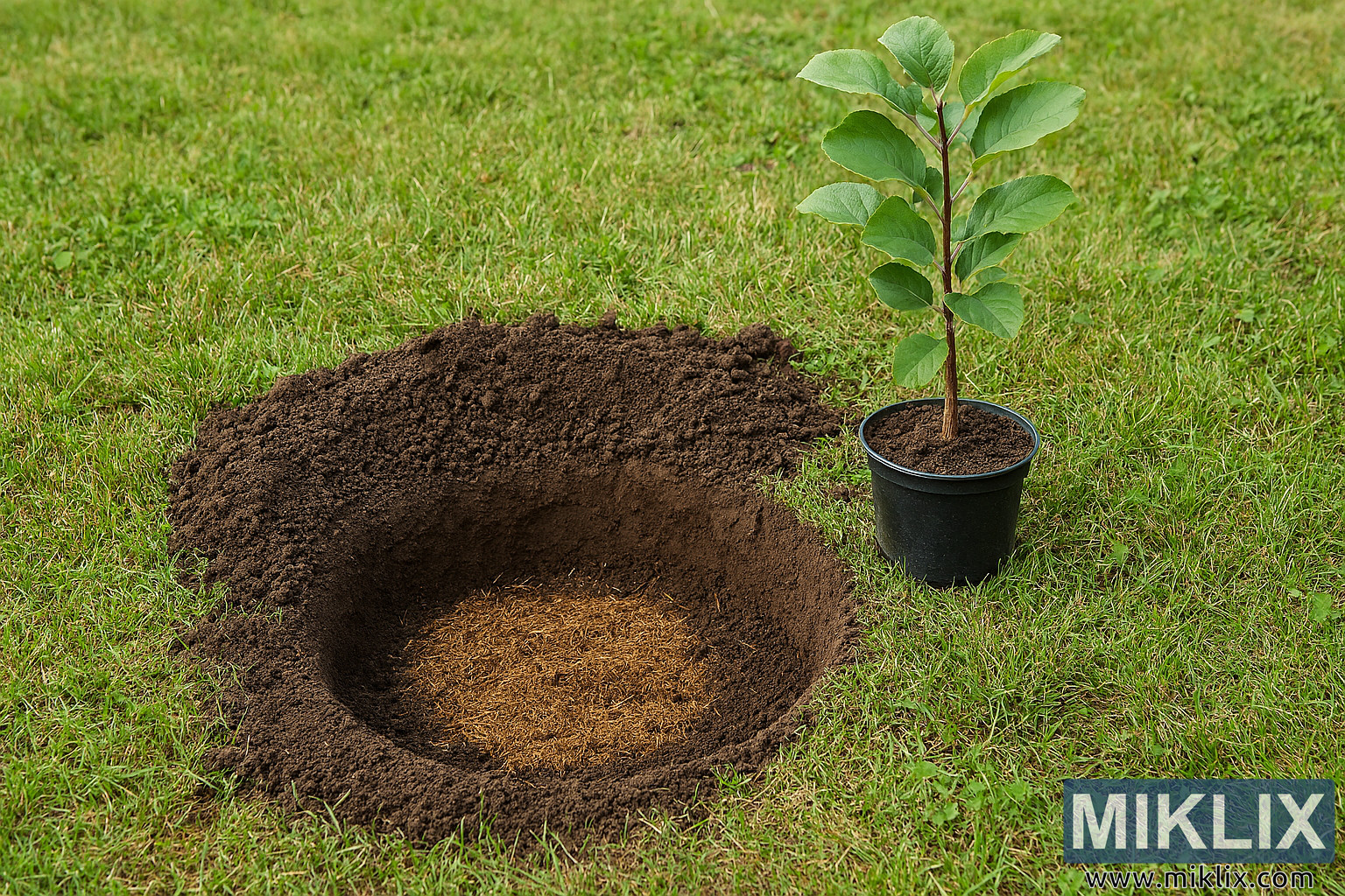 The composition is balanced, with the planting hole and sapling slightly off-center, drawing attention to the preparation process. The background features a continuation of the grassy area with subtle variations in texture and color. The lighting is even and diffused, casting soft shadows that enhance depth without harsh contrasts. This image serves as an educational reference for proper tree planting techniques, emphasizing soil preparation, organic layering, and sapling readiness in a realistic garden environment.