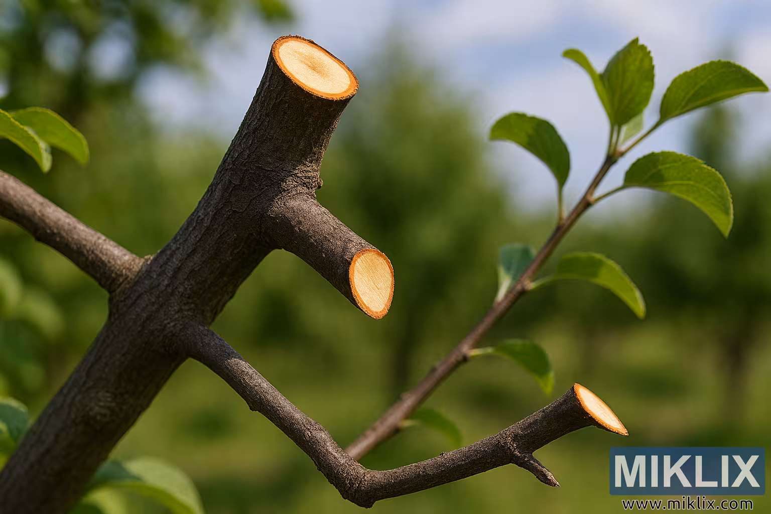 Surrounding the pruned areas are vibrant green leaves with slightly serrated edges and prominent veining. These elliptical leaves vary in maturity, with some fully developed and others emerging, all attached to slender greenish-brown stems. Sunlight filters through the canopy, casting soft shadows and highlighting the leaf textures and branch contours. The background is softly blurred, composed of lush green foliage and a pale blue sky with wispy white clouds, creating a natural bokeh effect that draws attention to the pruned branches.