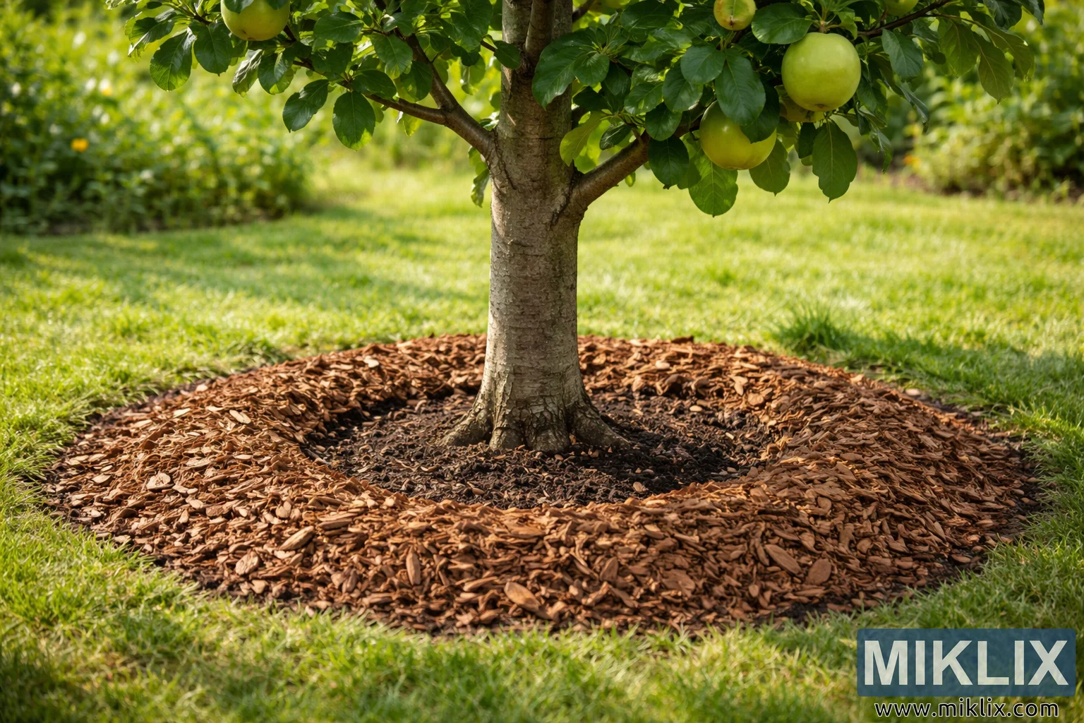 Overall, the image serves as a clear visual example of best practices for mulching around fruit trees. It highlights the importance of maintaining a visible root flare, keeping mulch away from the trunk, applying an appropriate depth, and extending the mulch ring outward to cover the critical root zone. The scene communicates both horticultural care and aesthetic order, demonstrating how proper mulch application supports tree health while enhancing the overall appearance of a landscape.