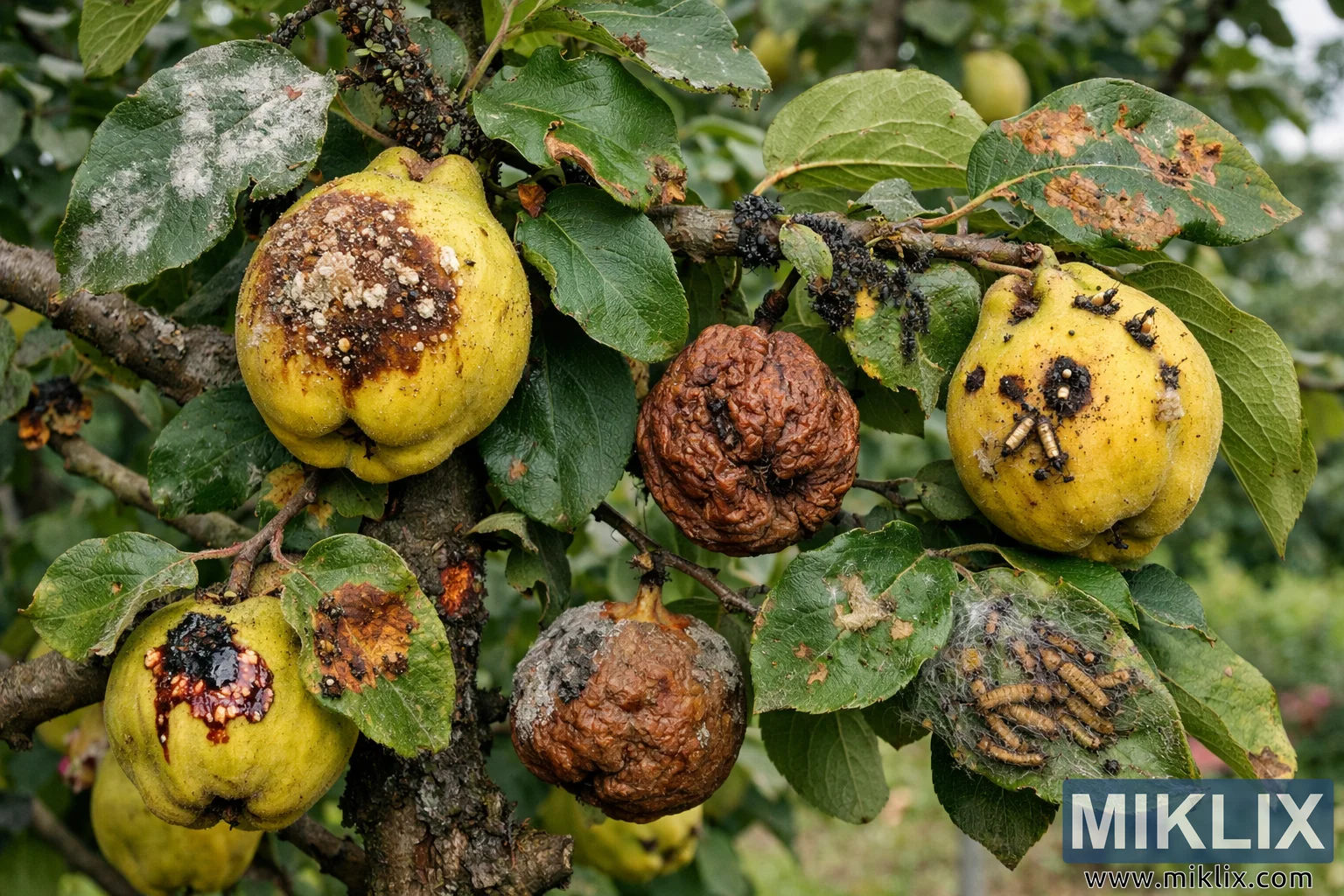 High-resolution landscape image of a quince tree displaying multiple pest infestations and disease symptoms, including fungal rot, insect larvae, aphids, and damaged foliage.