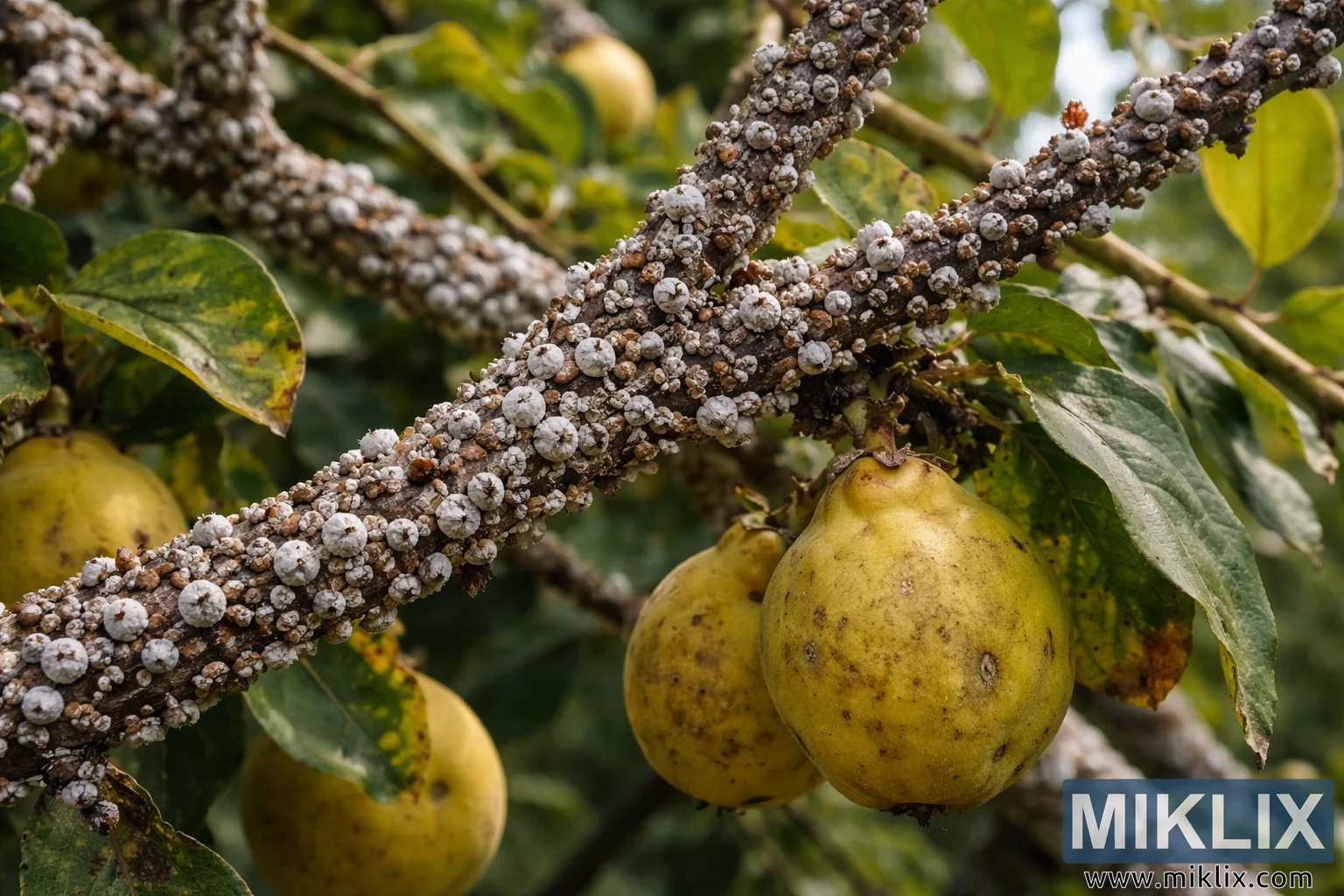 Detailed landscape photograph of a quince tree branch severely infested with scale insects, showing waxy white clusters on bark, yellowing leaves, and ripening quinces.