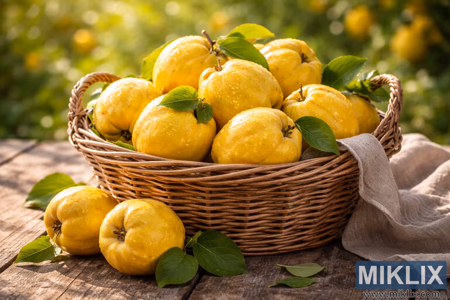 High-resolution landscape photo of a wicker basket filled with golden quinces, set on a rustic wooden table with soft sunlight and green orchard background.