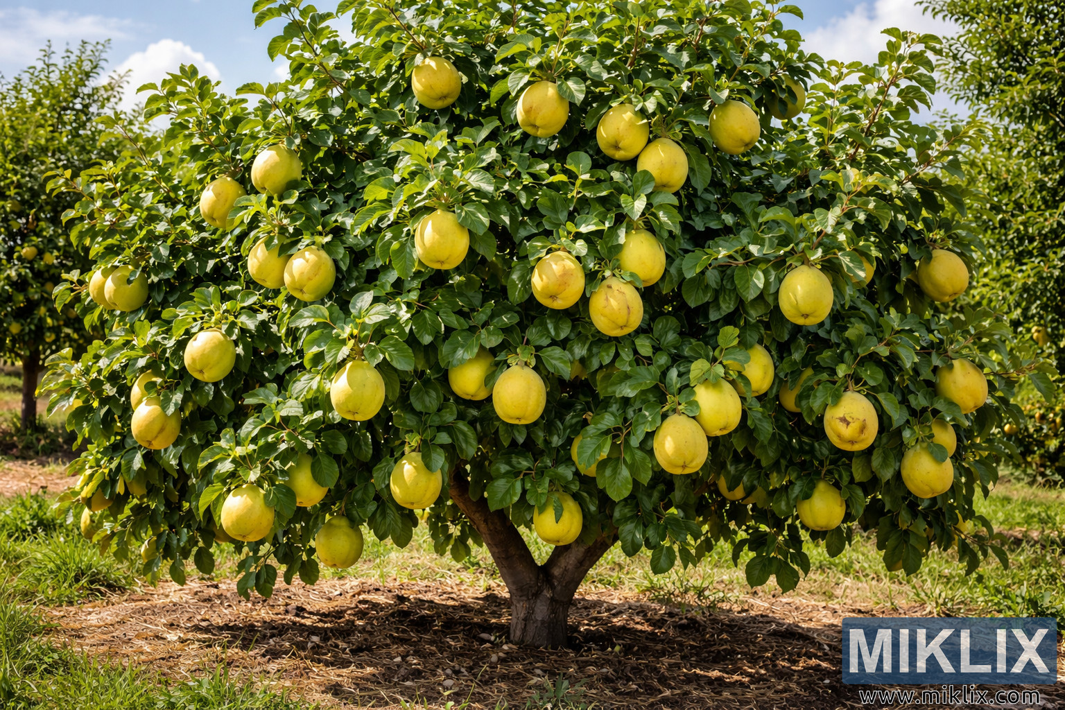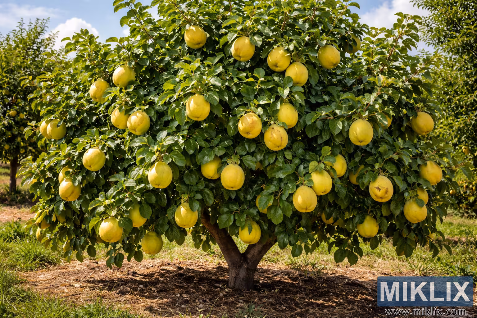 Landscape photograph of a thriving quince tree with abundant golden fruit, lush green leaves, and a well-maintained orchard setting under bright daylight.