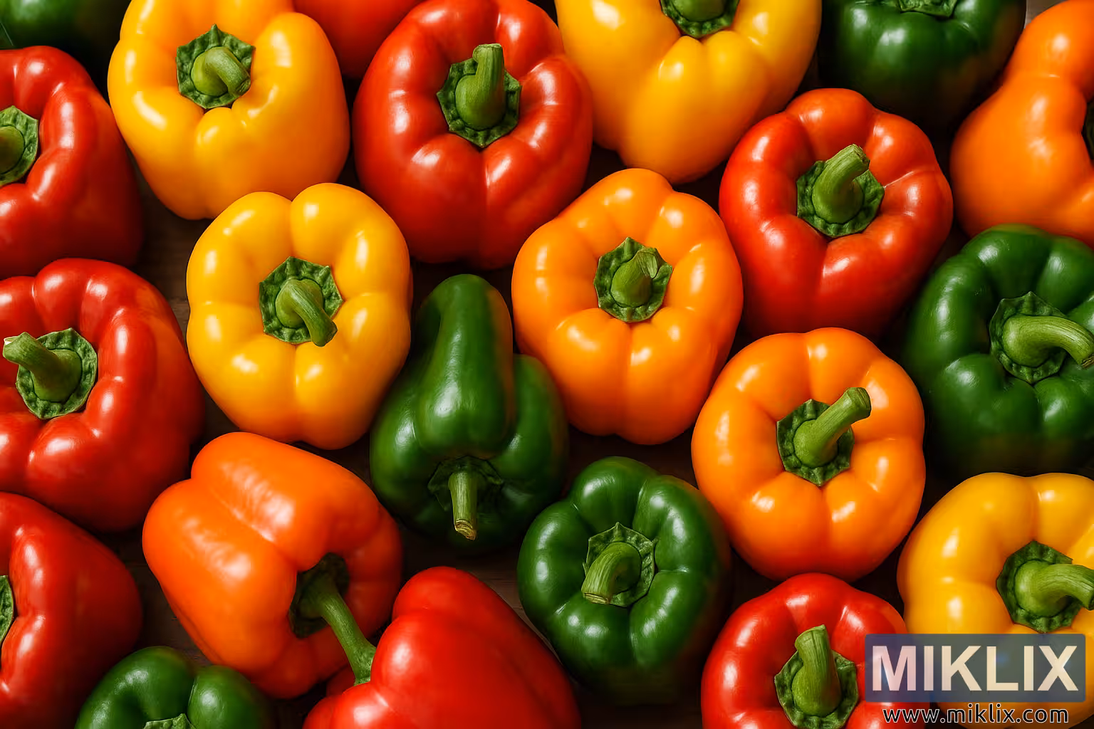 High-resolution landscape photo showcasing a colorful assortment of bell peppers in red, yellow, orange, and green, arranged in a vibrant, detailed composition.