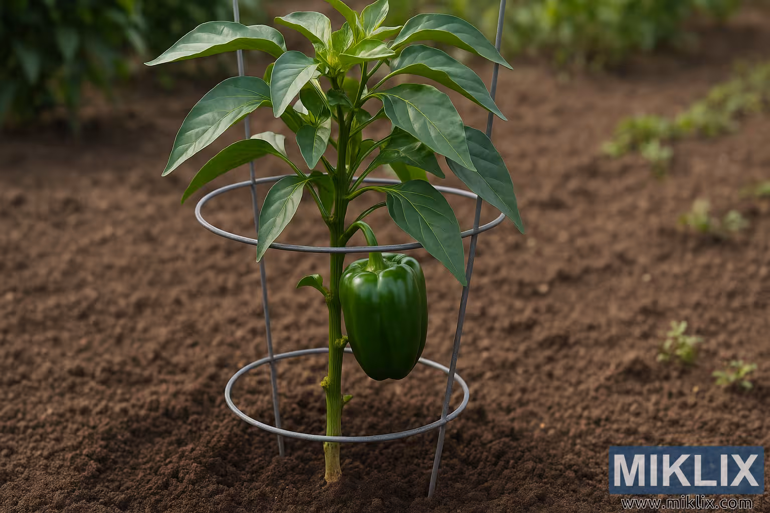 This image shows a healthy young bell pepper plant growing in a well-maintained garden bed, supported by a metal wire cage designed to keep the plant upright as it matures. The soil surrounding the plant is finely textured, evenly tilled, and free from debris, giving the scene an organized and deliberate appearance typical of a carefully managed vegetable garden. The bell pepper plant has a sturdy central stem with its lower branches properly pruned, leaving the bottom portion clean and open to improve airflow and reduce the risk of soil-borne diseases. This pruning also helps the plant focus its energy on developing strong upper foliage and fruit production. A single, glossy green bell pepper hangs from one of the mid-level branches, appearing firm, smooth, and well-shaped. The leaves are vibrant green with a healthy sheen, displaying no signs of discoloration or pests. The metal cage encircles the plant with evenly spaced rings that provide support as the plant grows taller and begins to bear more weight from multiple fruits. The background is softly blurred, with subtle patches of greenery indicating additional plants or garden rows beyond the focal area. Natural daylight illuminates the scene, casting soft shadows and highlighting the plant's texture and form. Overall, the image conveys a sense of proper garden care, showcasing effective plant training, pruning techniques, and structural support for optimal bell pepper growth.