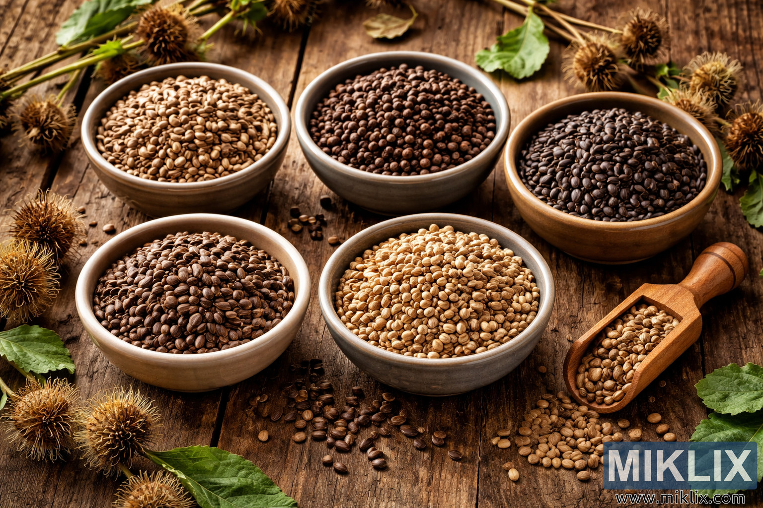 Image: Burdock Seed Varieties in Rustic Bowls on Wooden Table