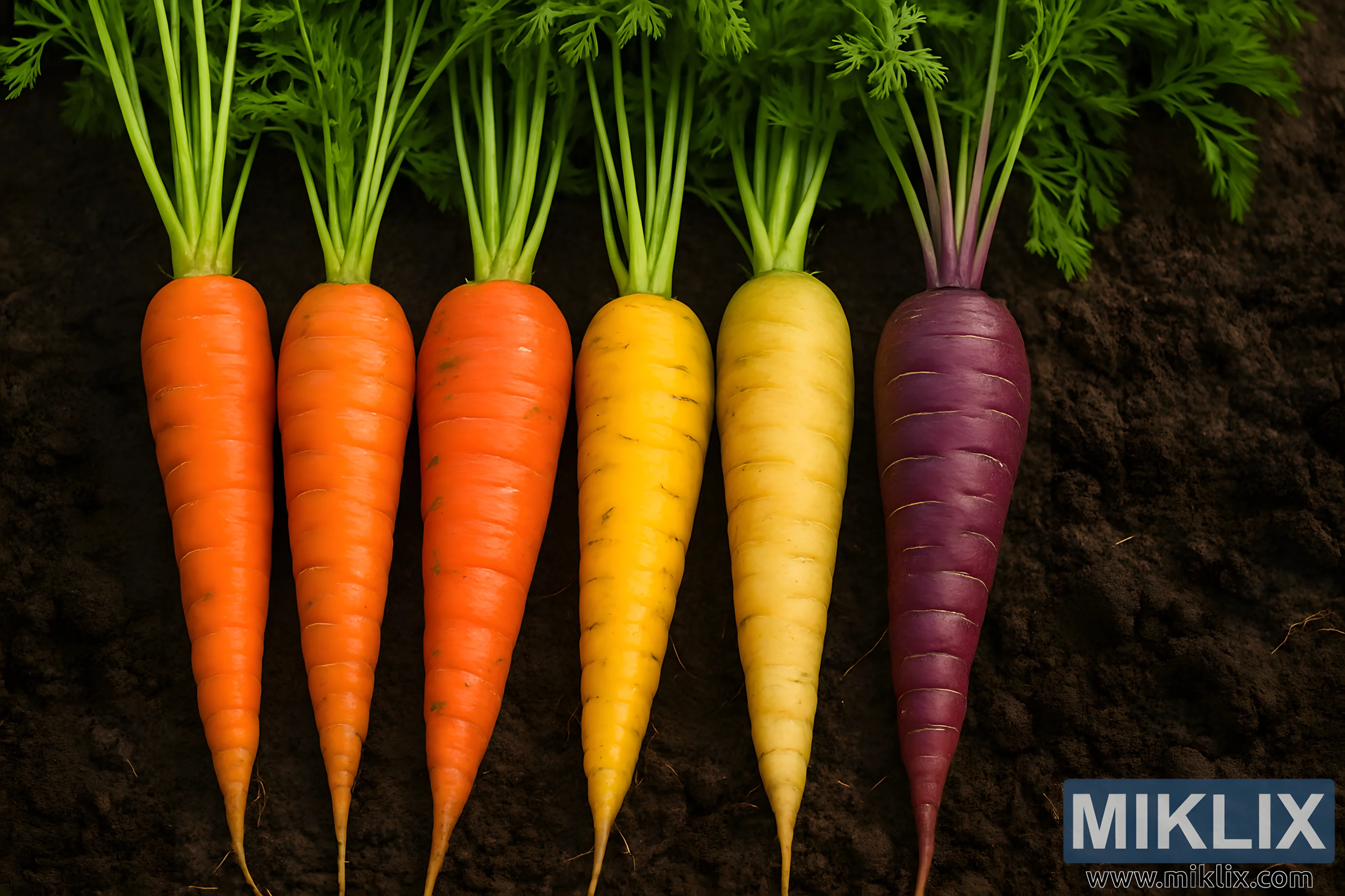 A vivid landscape photo of freshly harvested multicolored carrots arranged on rich, dark soil, showcasing natural textures and vibrant hues.
