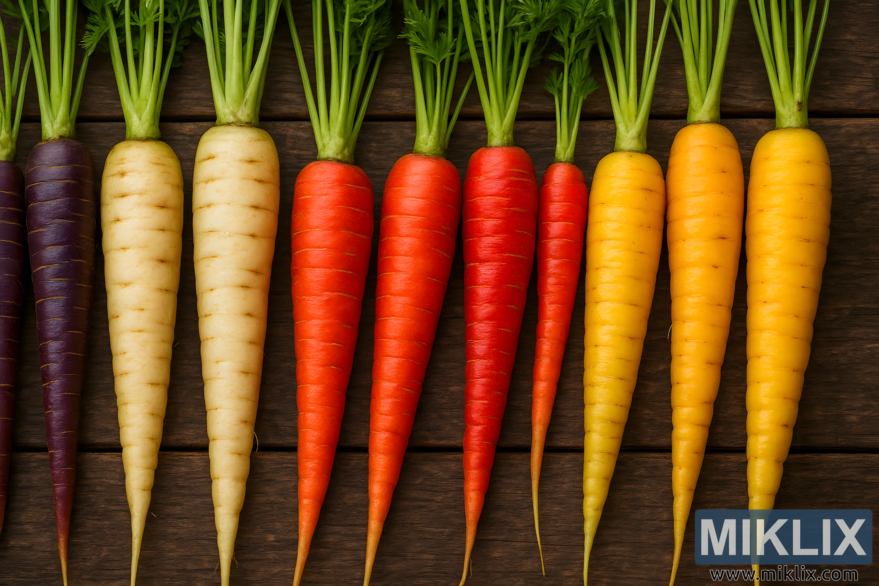 A vibrant assortment of colorful carrot varieties—purple, white, red, and yellow—displayed neatly on a rustic wooden background.