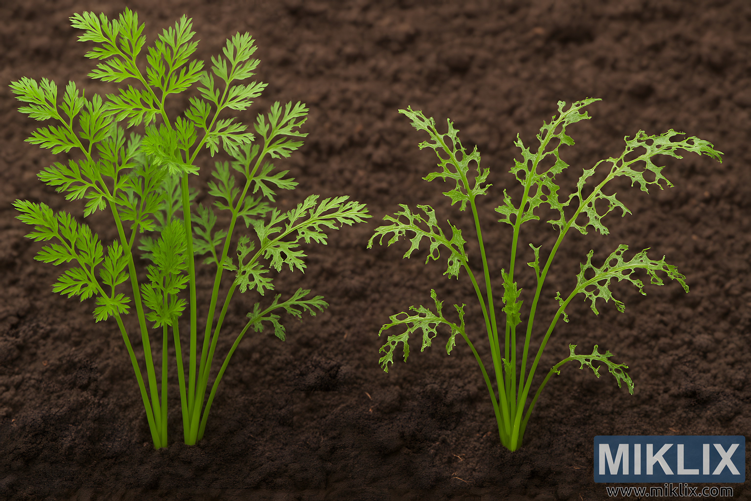 A detailed comparison of healthy carrot foliage versus pest-damaged carrot tops, showing clear visual differences in leaf density, color, and structural integrity.