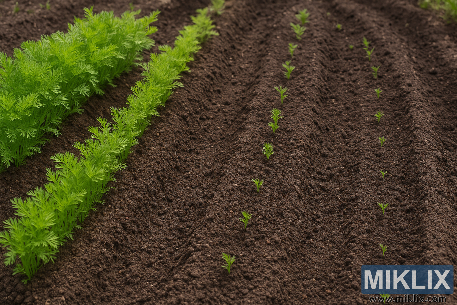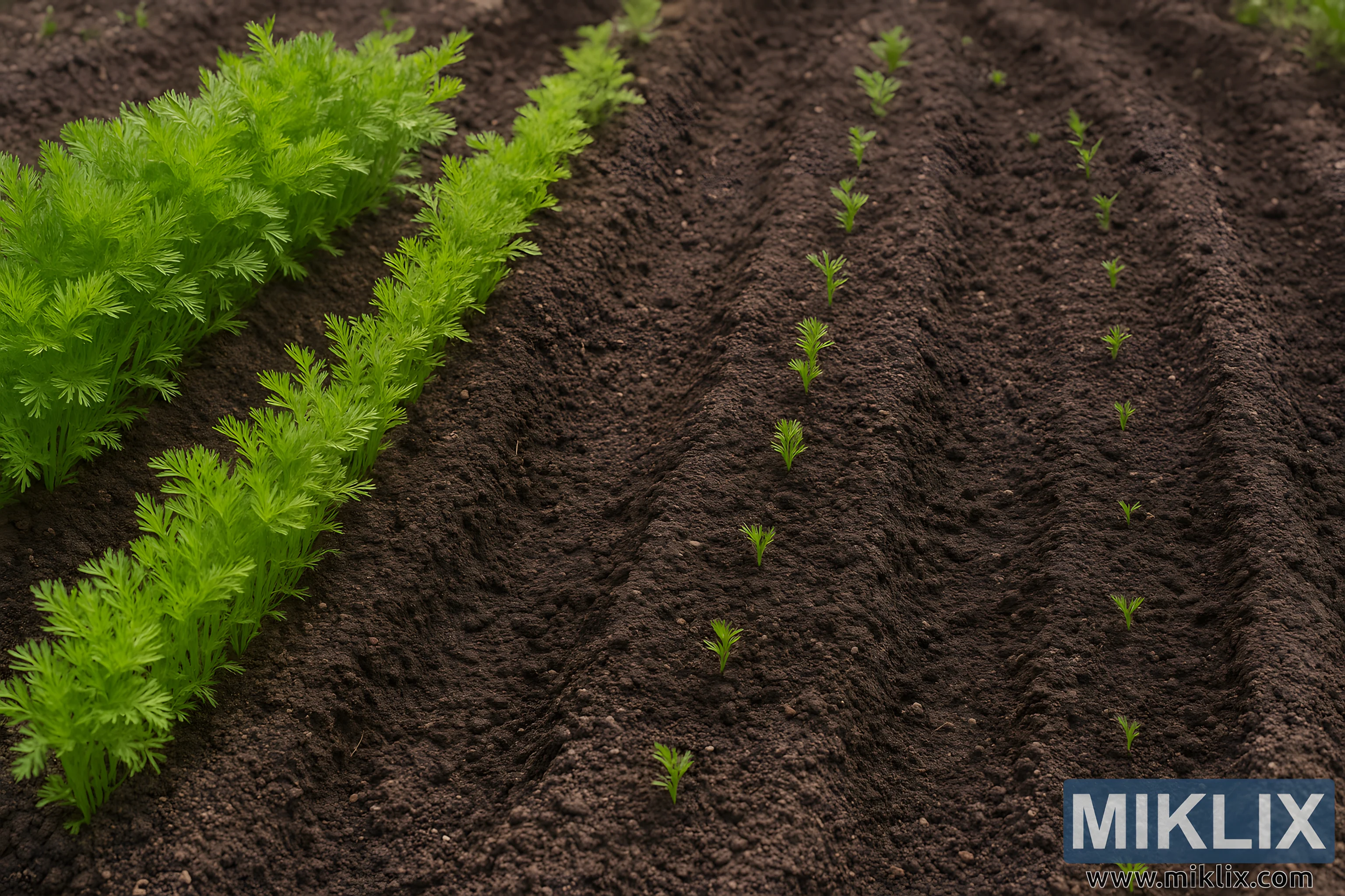 A detailed view of succession planting in a garden bed, featuring carrot seedlings and mature foliage in well-structured soil rows.