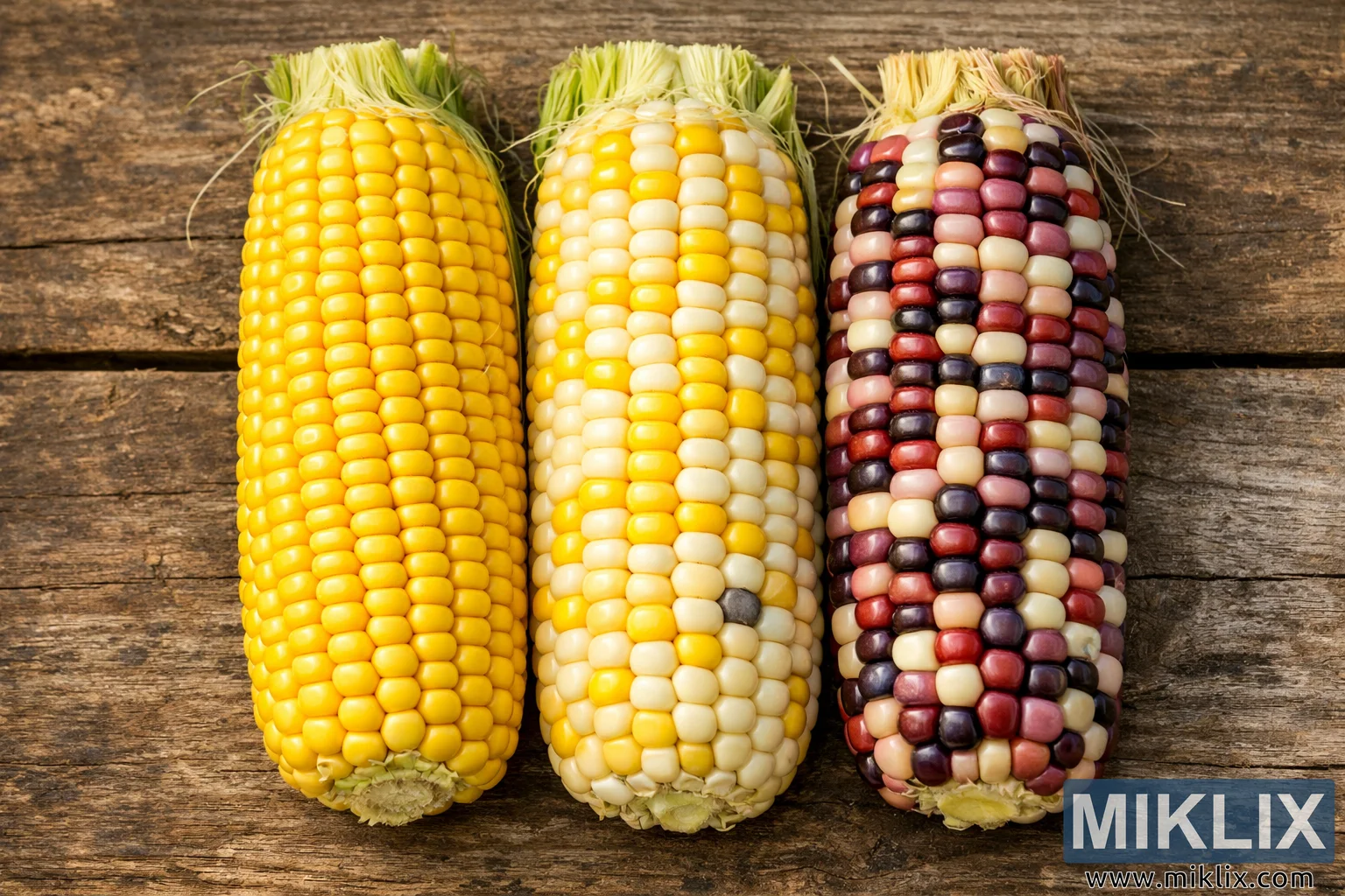 High-resolution image of three ears of sweet corn showing different kernel colors and arrangements on a rustic wooden background.