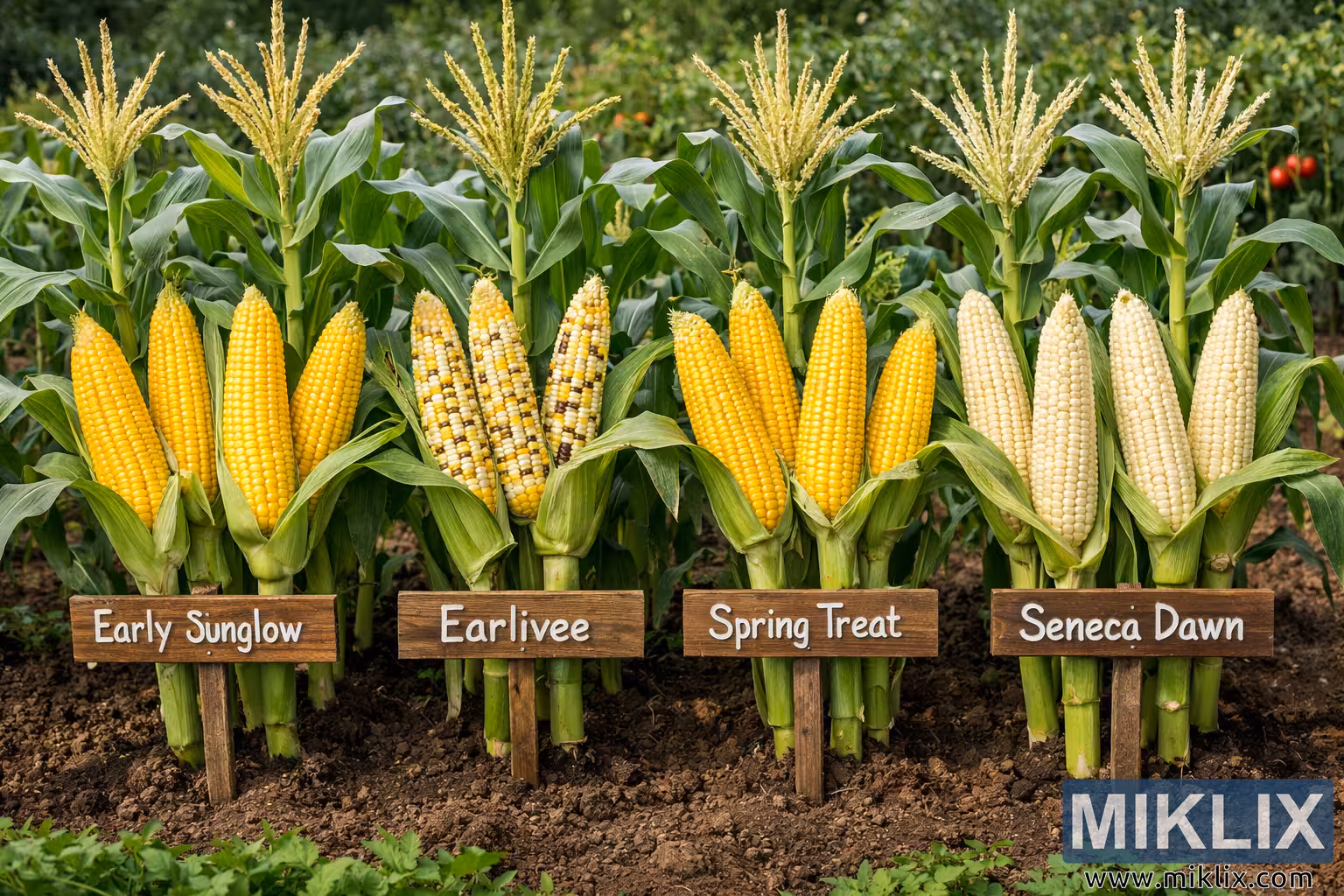 Photo of four cool-season sweet corn varieties—Early Sunglow, Earlivee, Spring Treat, and Seneca Dawn—growing side by side in a vegetable garden with labeled wooden markers.
