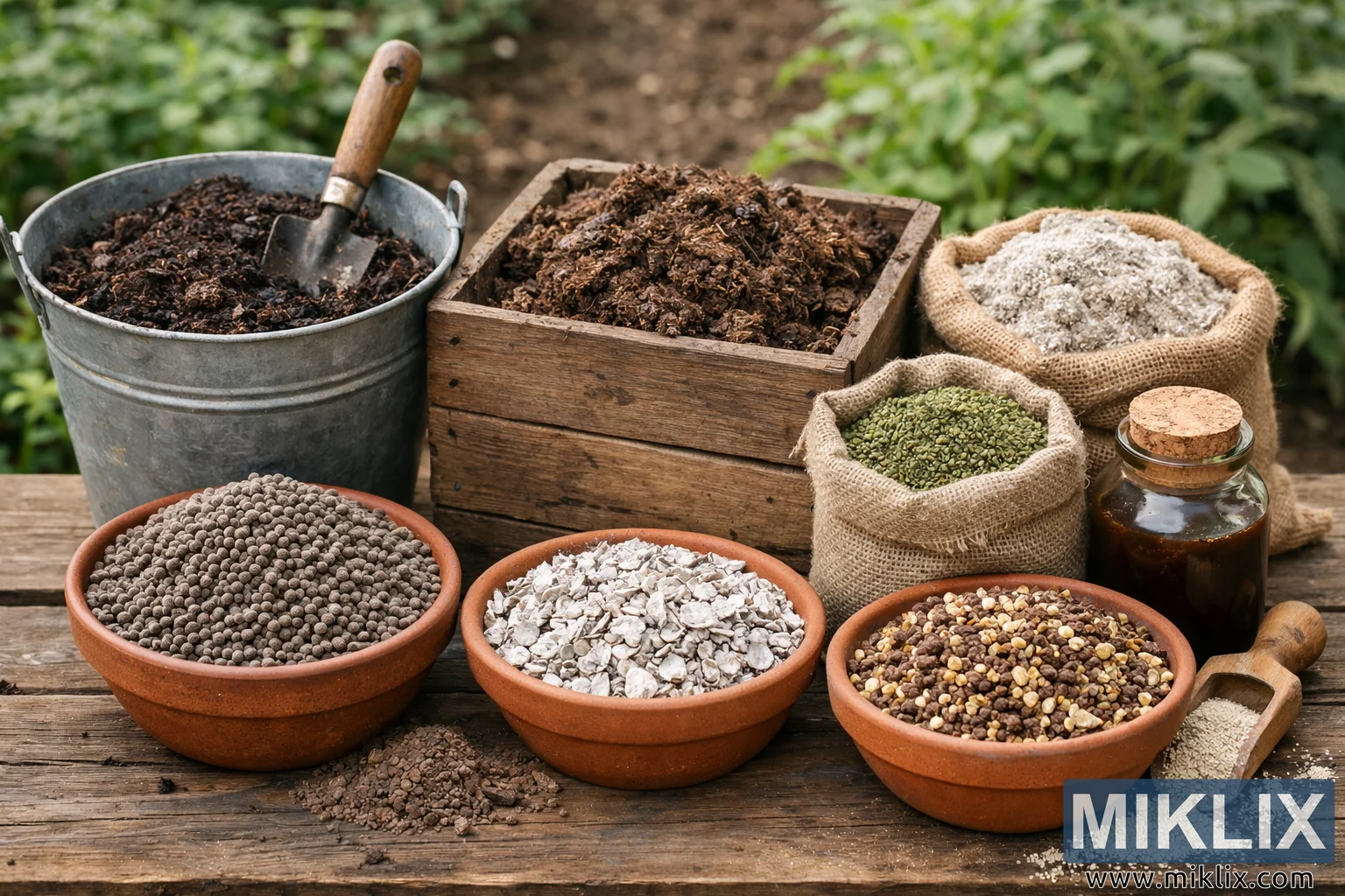 A variety of soil amendments such as compost, manure, and organic fertilizers arranged in containers on a wooden table in a garden setting.