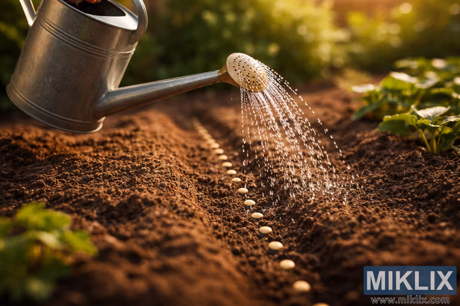 In the softly blurred background, hints of green foliage suggest nearby plants already growing in the garden. Their leaves catch the warm sunlight, adding touches of vibrant green that contrast with the deep brown tones of the soil. The shallow depth of field keeps the focus on the watering action and the seeds, while the background remains pleasantly out of focus, creating a calm, natural atmosphere.