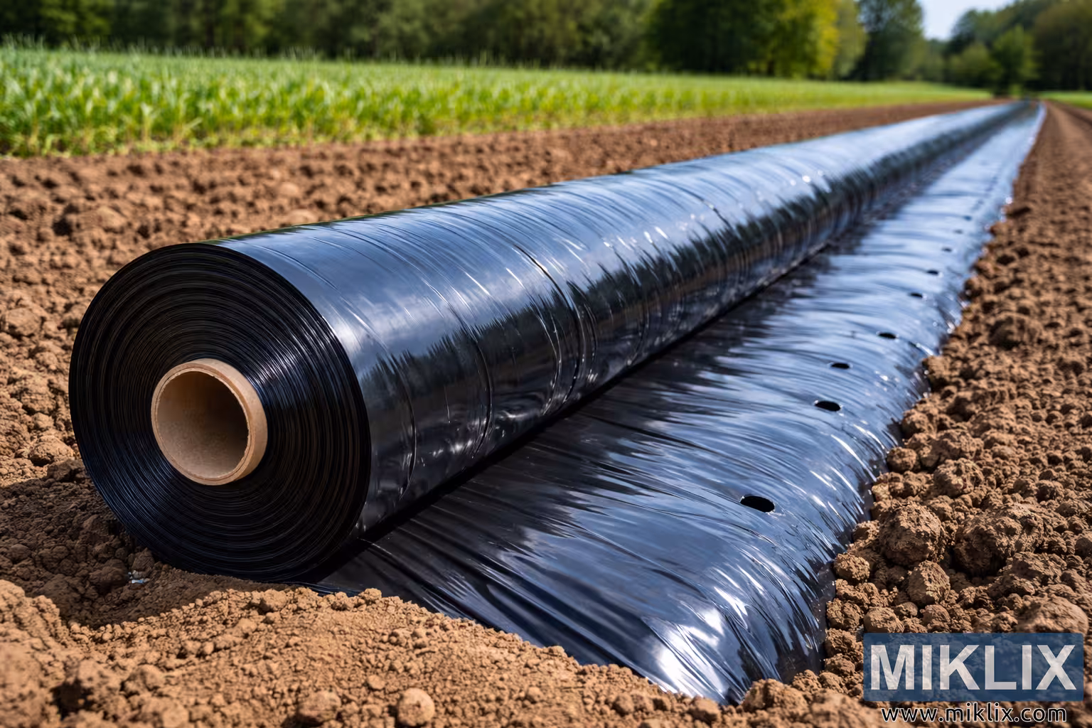High-resolution photo of a roll of black plastic mulch laid across freshly prepared soil beds, commonly used in agriculture for soil warming, moisture retention, and weed control.