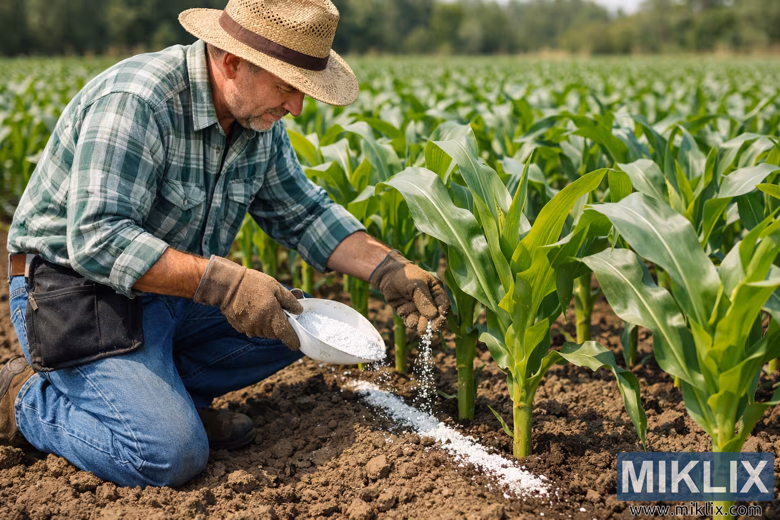 A gardener kneels between orderly rows of vibrant green corn plants that have reached the classic knee-high growth stage, carefully applying side-dress fertilizer along the base of the plants. Wearing a straw hat, plaid shirt, denim jeans, and sturdy work gloves, the gardener focuses on distributing small white fertilizer granules in a narrow band along the soil beside the corn stalks. The fertilizer is poured from a shallow white container and gently scattered by hand to ensure even placement near the plant roots without touching the stems directly. The soil in the field appears freshly cultivated, loose, and dark brown, forming slightly raised rows that guide water and nutrients toward the developing plants. Each corn plant stands upright with broad, glossy leaves extending outward and upward, capturing sunlight as they continue their rapid early-season growth. The gardener’s posture—kneeling with one knee on the ground and leaning slightly forward—suggests careful attention and precision while tending the crop. The background reveals long parallel rows of corn stretching toward the horizon, gradually softening into a gentle blur that emphasizes the scale of the field and the repetitive agricultural pattern. Bright natural sunlight illuminates the scene, highlighting the vivid green color of the corn leaves and the contrasting earthy tones of the soil. The light also catches the falling fertilizer granules mid-motion, creating a subtle sense of movement and texture in the foreground. A distant tree line frames the far edge of the field, while a lightly clouded sky suggests a calm, warm day ideal for fieldwork. The image captures an important moment in crop management when supplemental nutrients are applied during the vegetative growth stage to support strong stalk development and future ear formation. Overall, the scene conveys patience, agricultural knowledge, and hands-on stewardship of the land, illustrating a traditional and careful method of nurturing young corn plants to ensure healthy growth and a productive harvest later in the season.