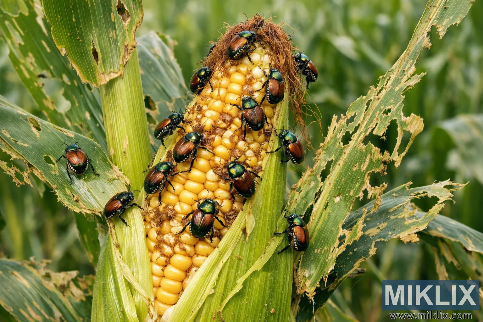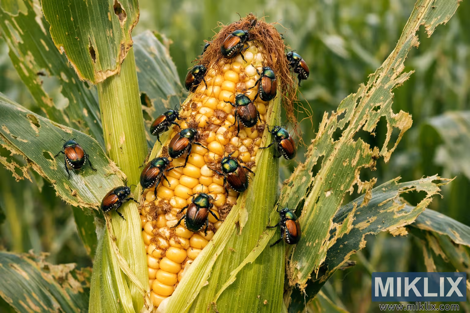 High-resolution photo showing Japanese beetles clustered on a corn ear and heavily damaged leaves in a cornfield, illustrating insect pest damage to maize crops.