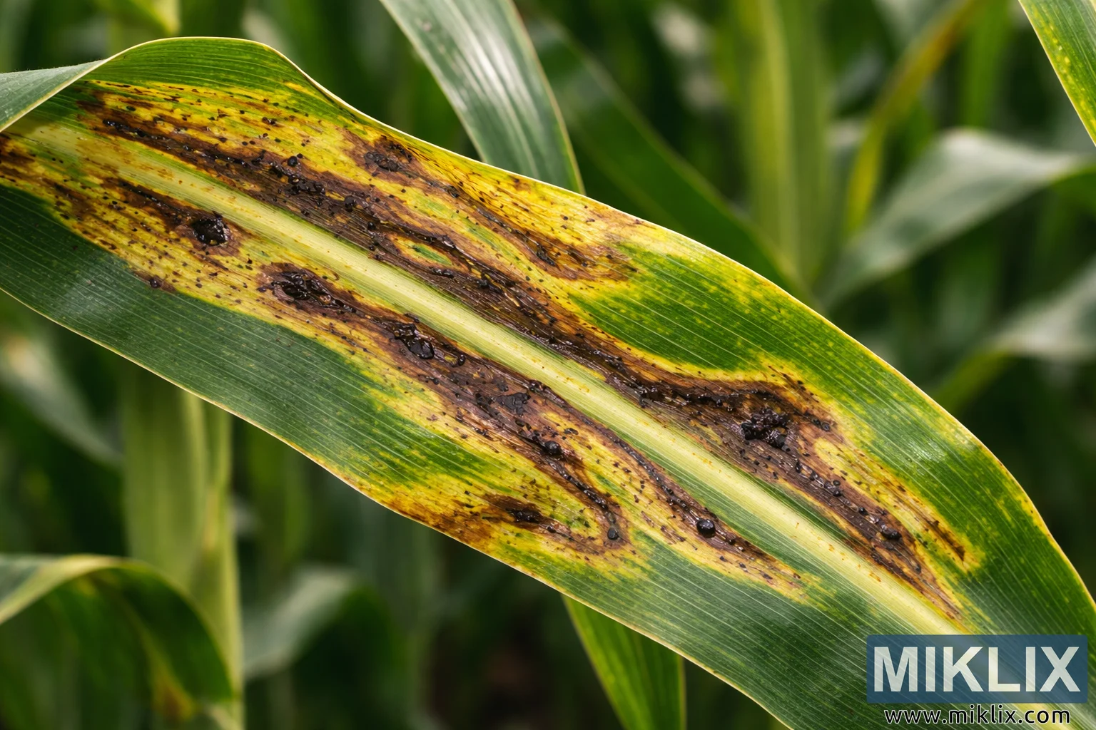 Detailed close-up image of a corn leaf affected by Stewart’s bacterial wilt, displaying elongated yellow-brown lesions with dark bacterial exudates and chlorotic halos.