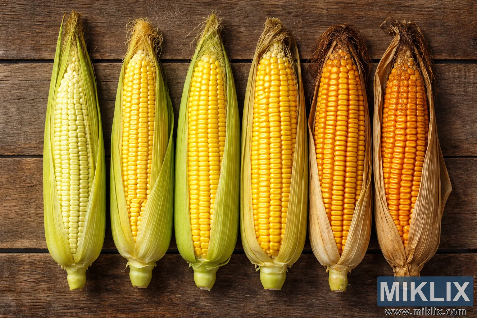 Comparison image of corn ears at different maturity stages, progressing from immature pale kernels to fully mature yellow kernels and finally overripe, dried orange kernels.