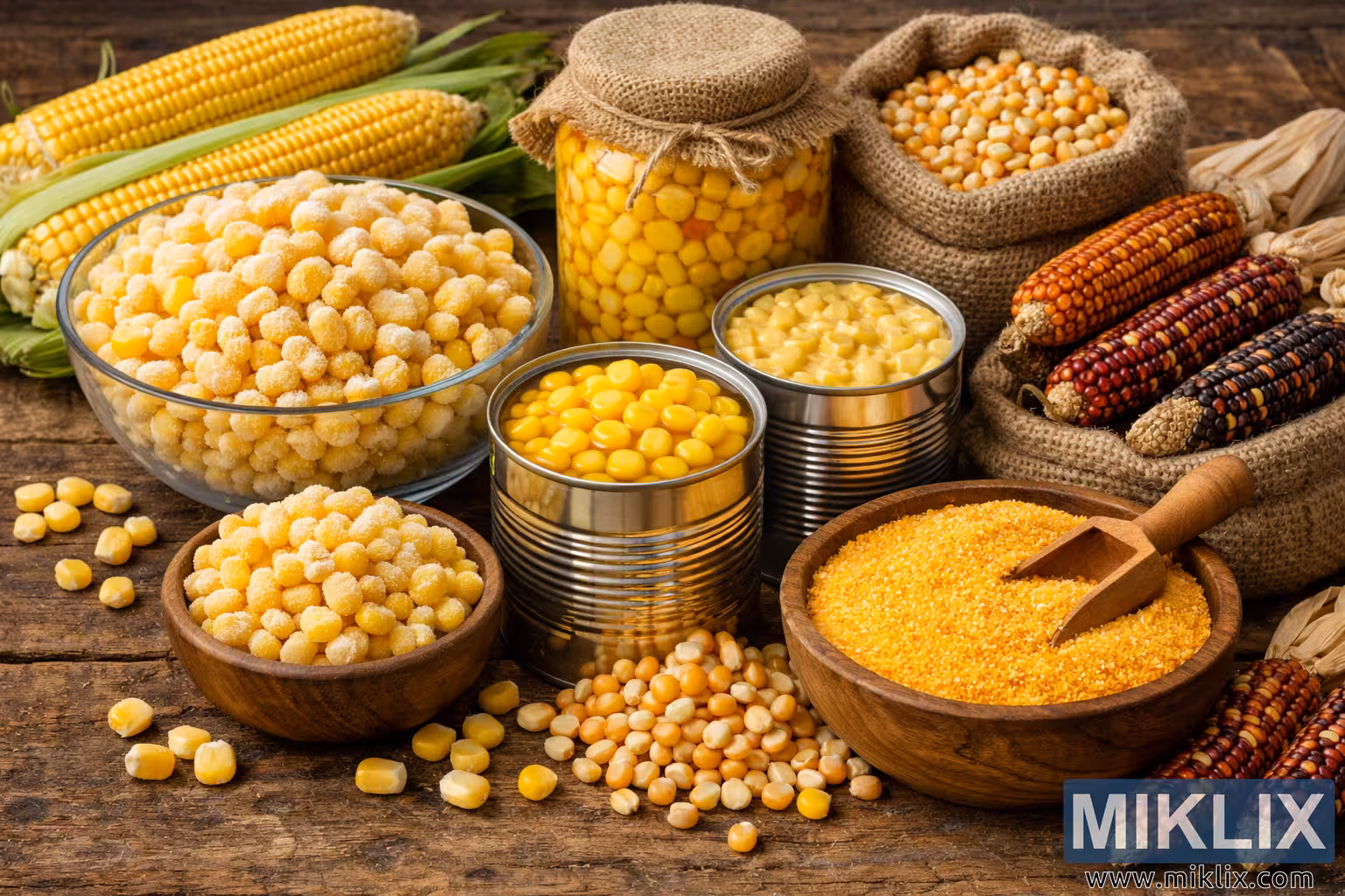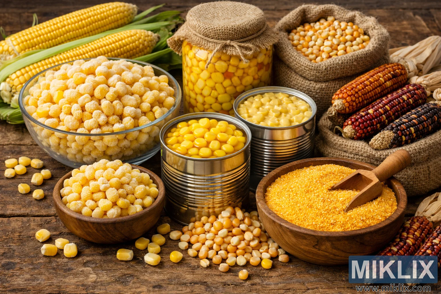 High-resolution image showing a variety of preserved corn products including frozen kernels, canned corn, dried corn cobs, and cornmeal arranged on a rustic wooden surface.