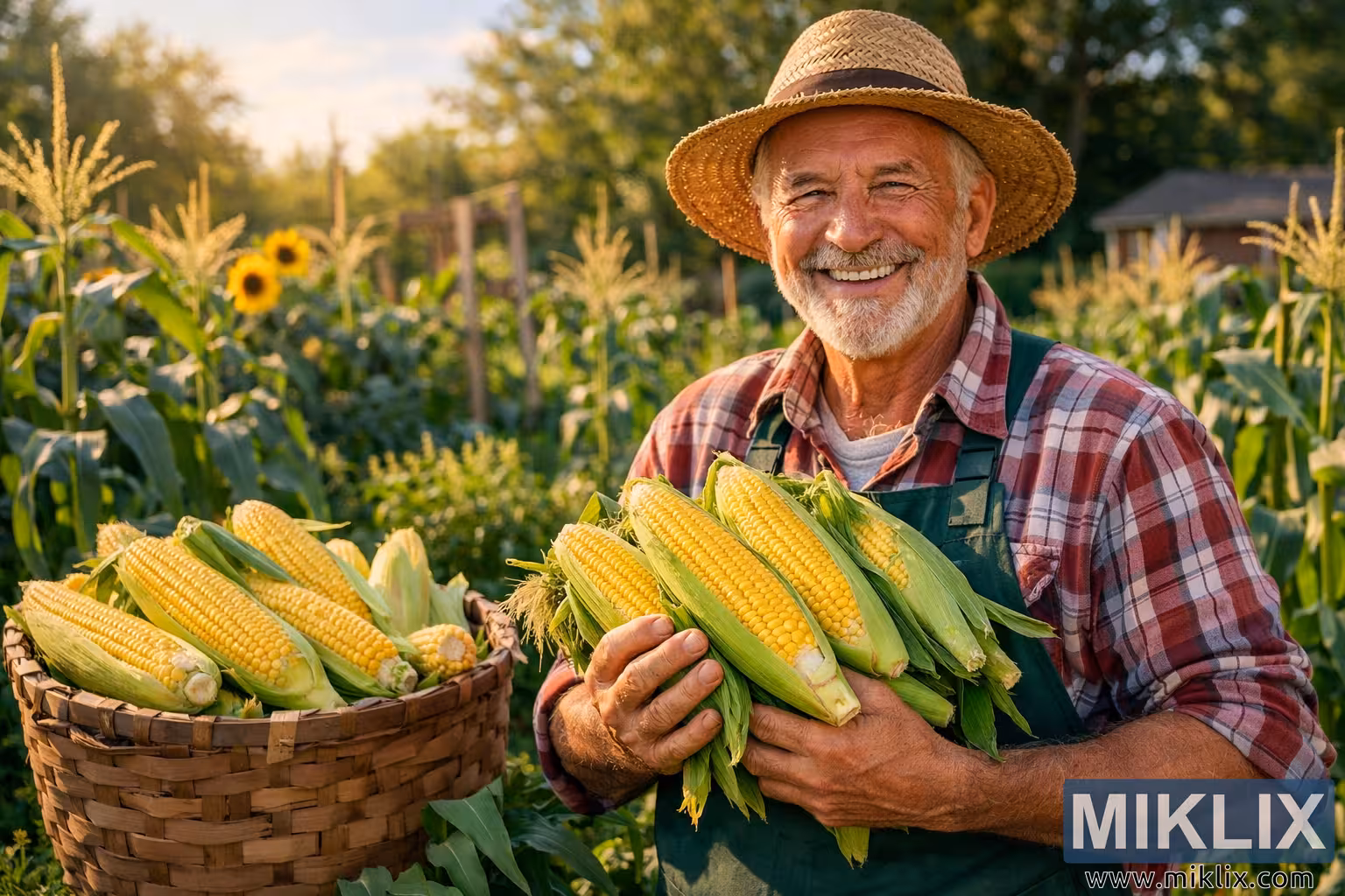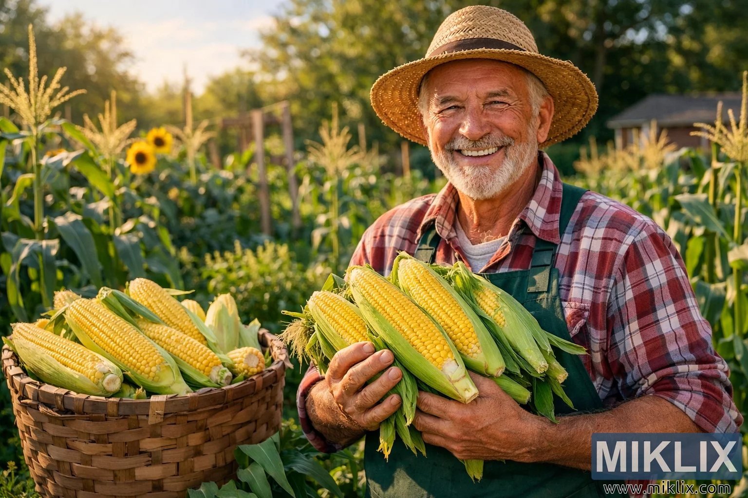 Beside him sits a rustic woven basket brimming with additional freshly picked corn. The basket rests among the tall green stalks of the corn plants, which rise in orderly rows throughout the garden. The plants are healthy and vibrant, with long green leaves and tassels catching the soft golden sunlight. A few yellow sunflowers bloom in the background, adding cheerful color and emphasizing the fertile, flourishing atmosphere of the garden.