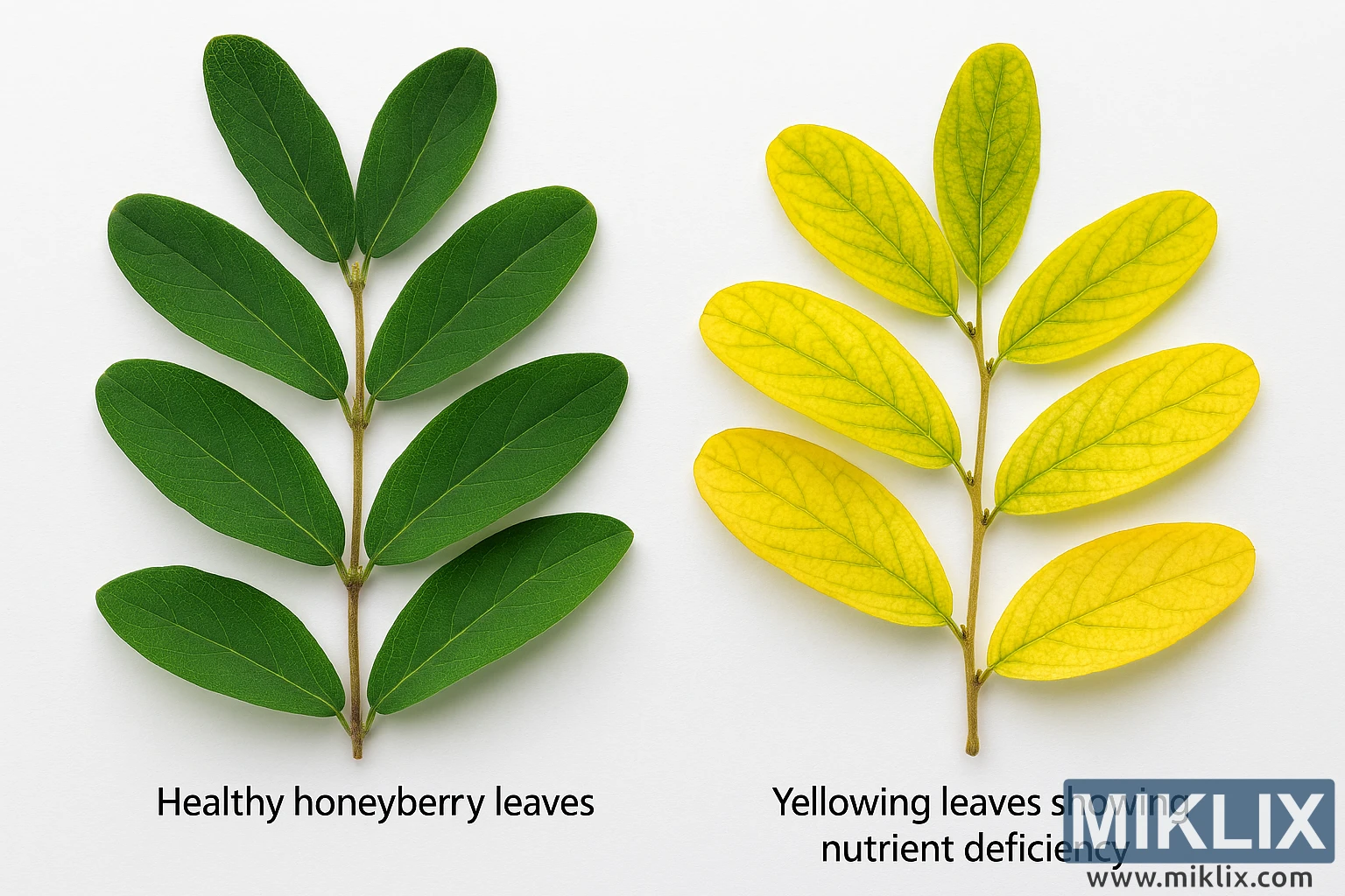 High-resolution comparison of honeyberry leaves: healthy green foliage versus yellowing leaves with nutrient deficiency, highlighting differences in color, texture, and plant health.