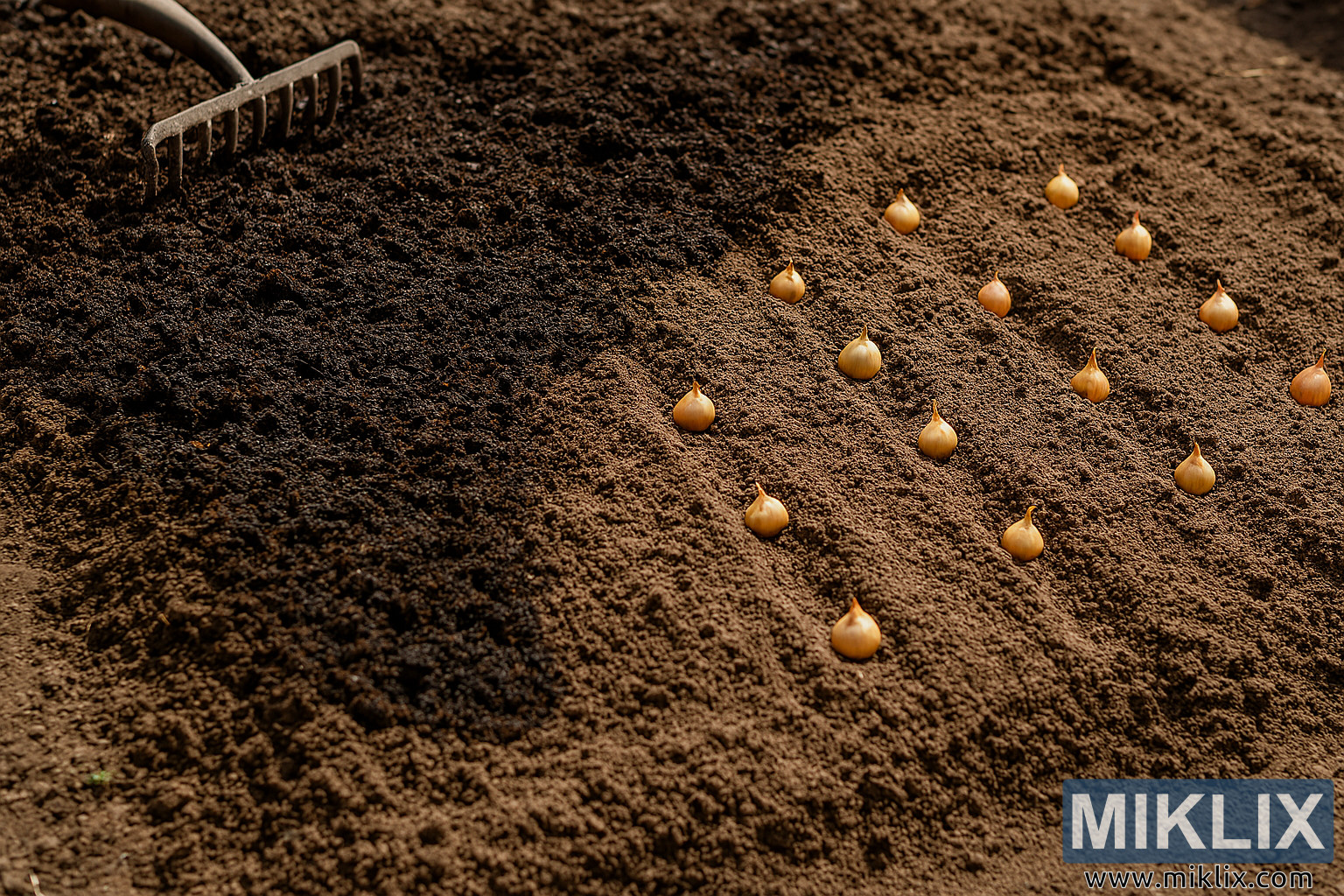 High-resolution image of a garden bed with compost being mixed into soil and onion sets planted in tilled rows, ideal for illustrating soil preparation techniques.