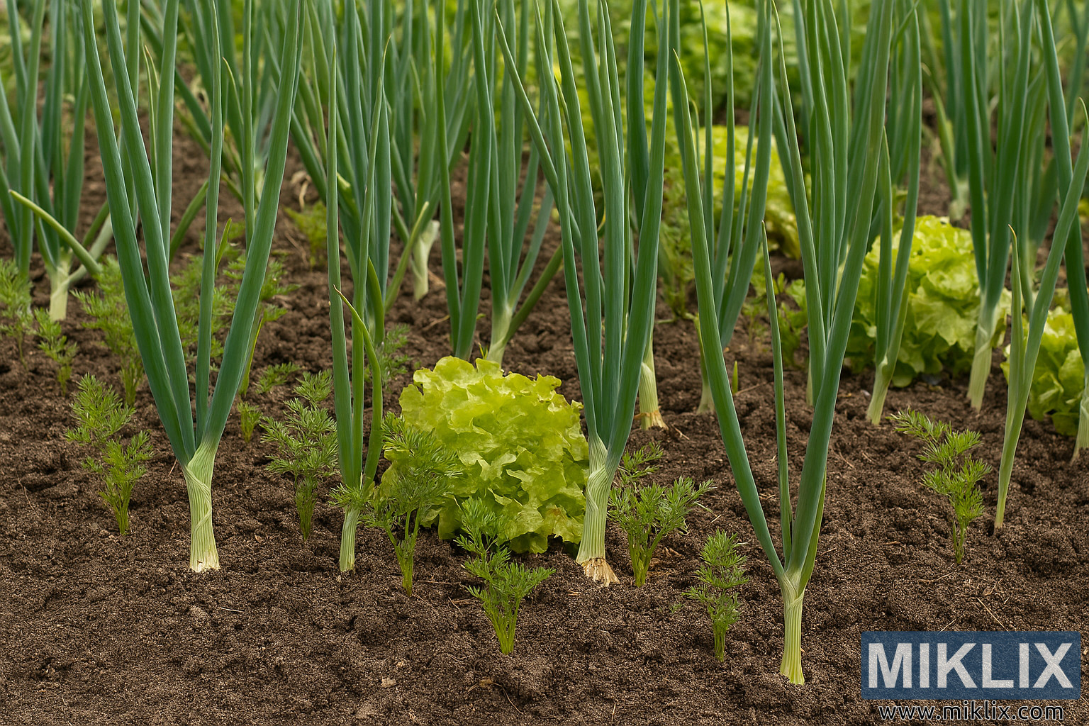 This image exemplifies sustainable horticultural practice, demonstrating how intercropping onions with carrots and lettuce can optimize space, deter pests, and improve soil health. It is ideal for educational use, gardening catalogs, or promotional materials focused on organic and regenerative agriculture.