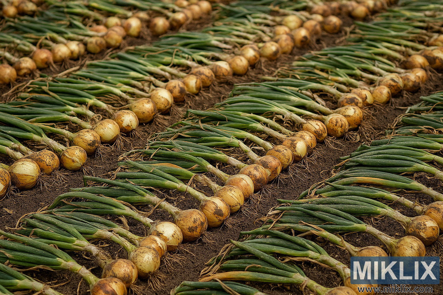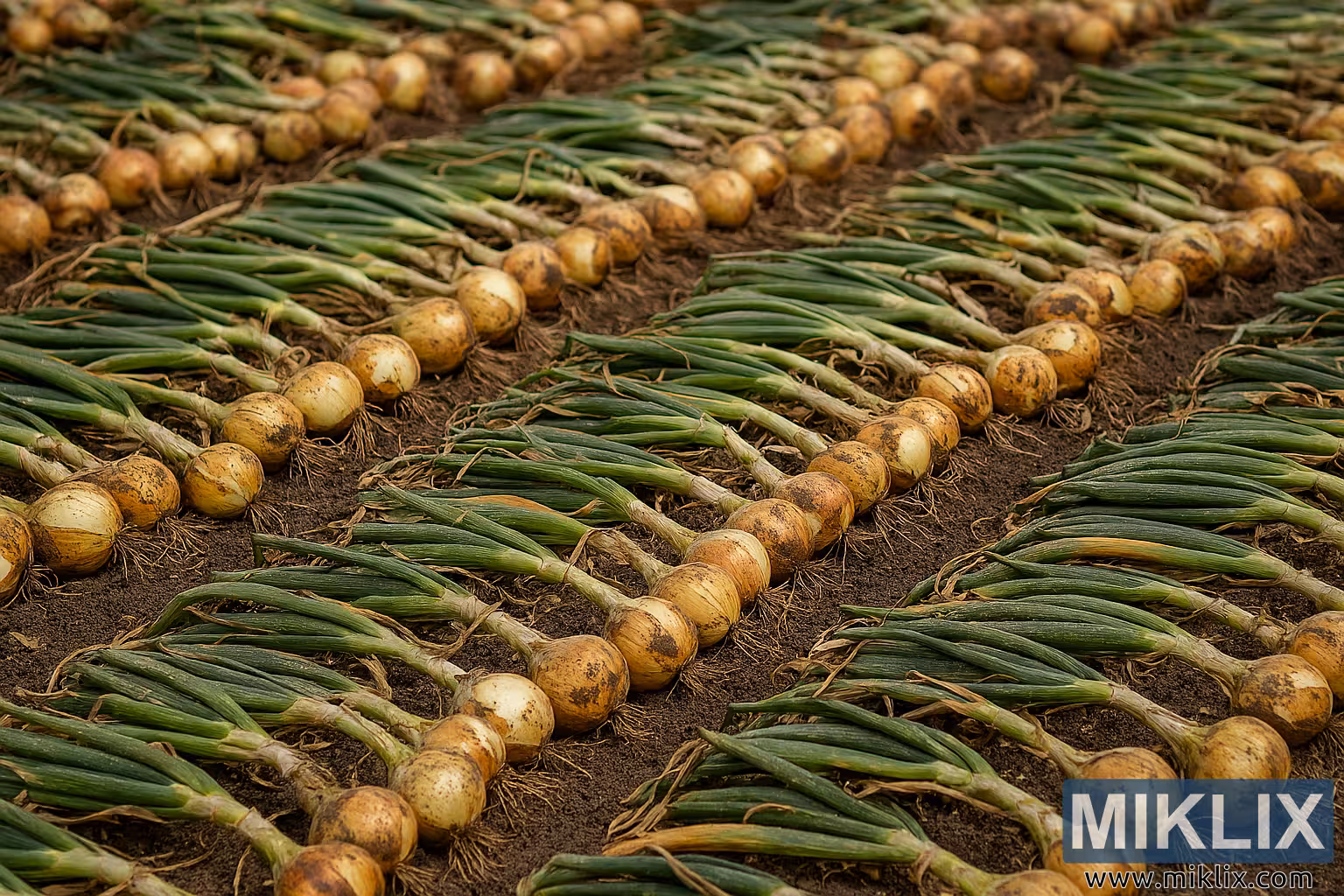 High-resolution image of freshly harvested onions laid out in parallel rows with tops attached, curing on rich soil in natural light
