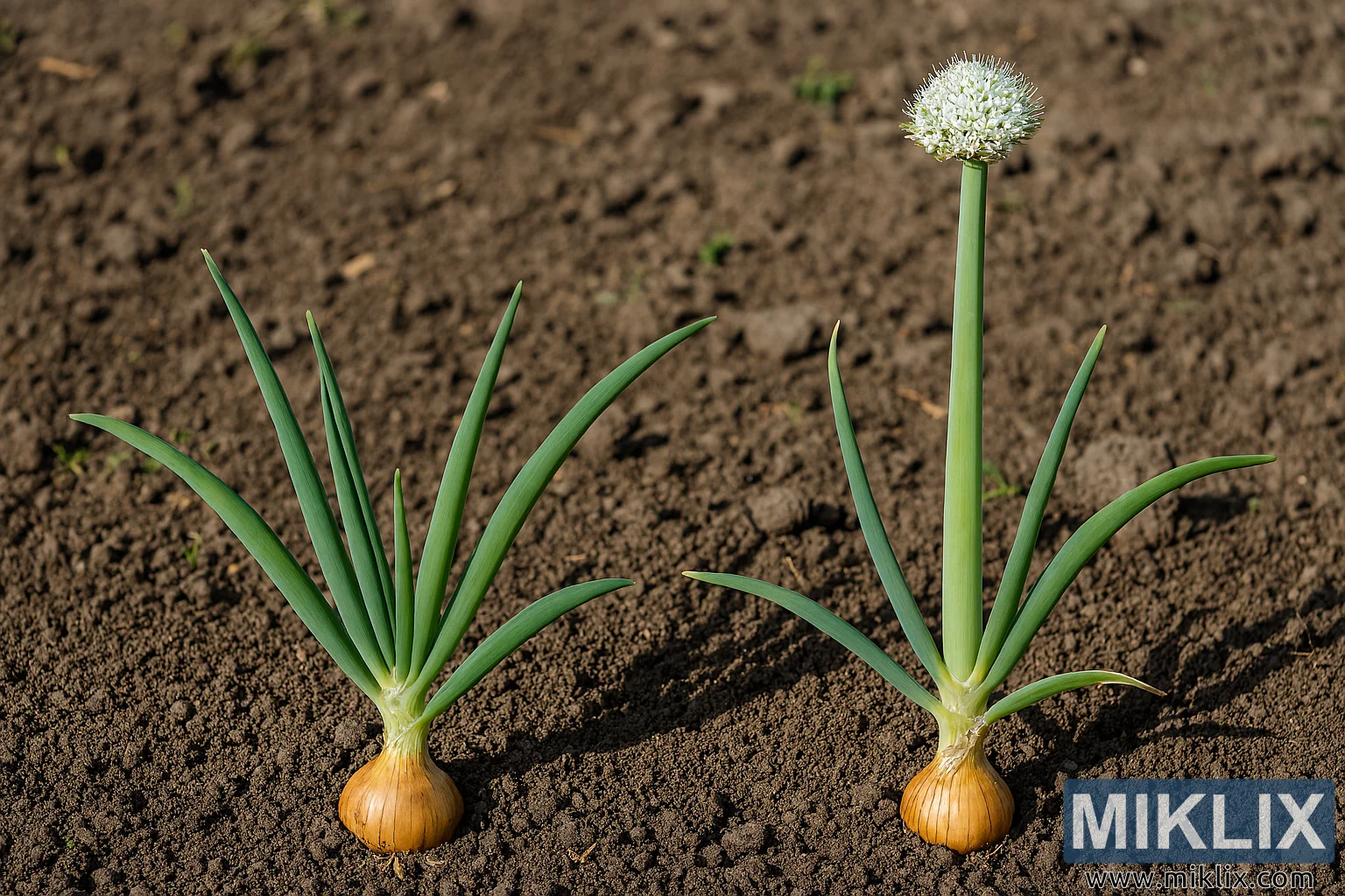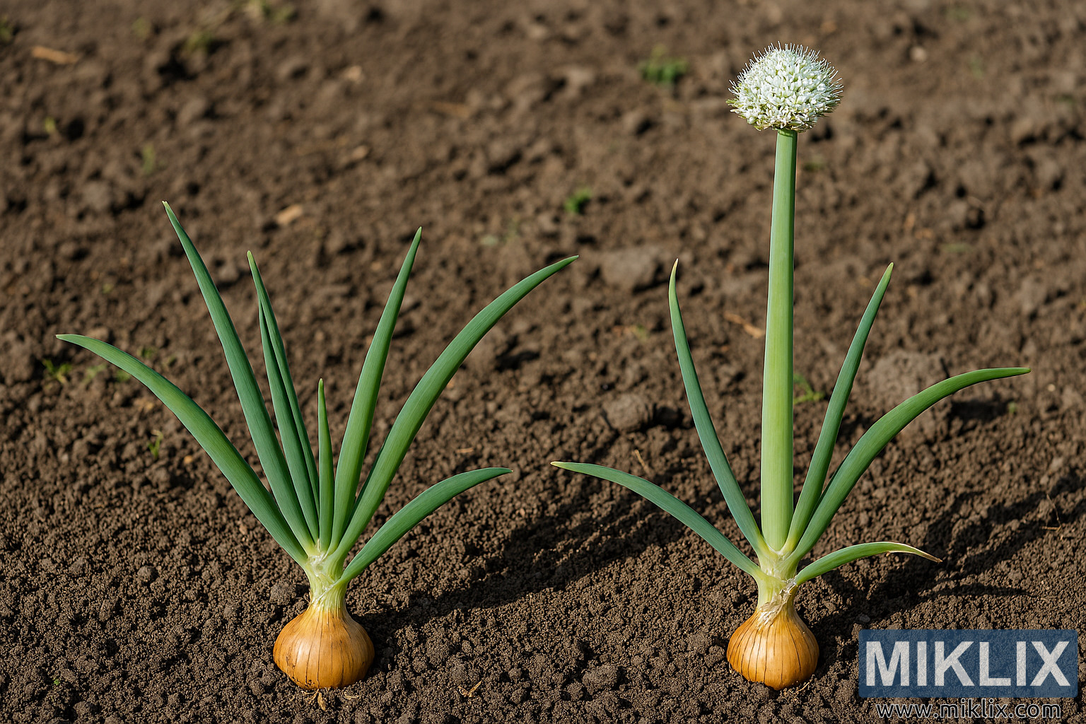 Landscape, high-resolution horticultural comparison featuring two onion plants (Allium cepa) side by side in a garden bed, captured in bright daytime natural light. The scene is composed with a clear left–right contrast: on the left, a healthy onion plant with vigorous foliage; on the right, a bolted onion exhibiting a prominent flower stalk terminating in a spherical inflorescence. The camera angle is low and close, emphasizing plant architecture, bulb exposure, leaf texture, and soil detail, while the background remains softly out of focus to keep attention on the subjects.