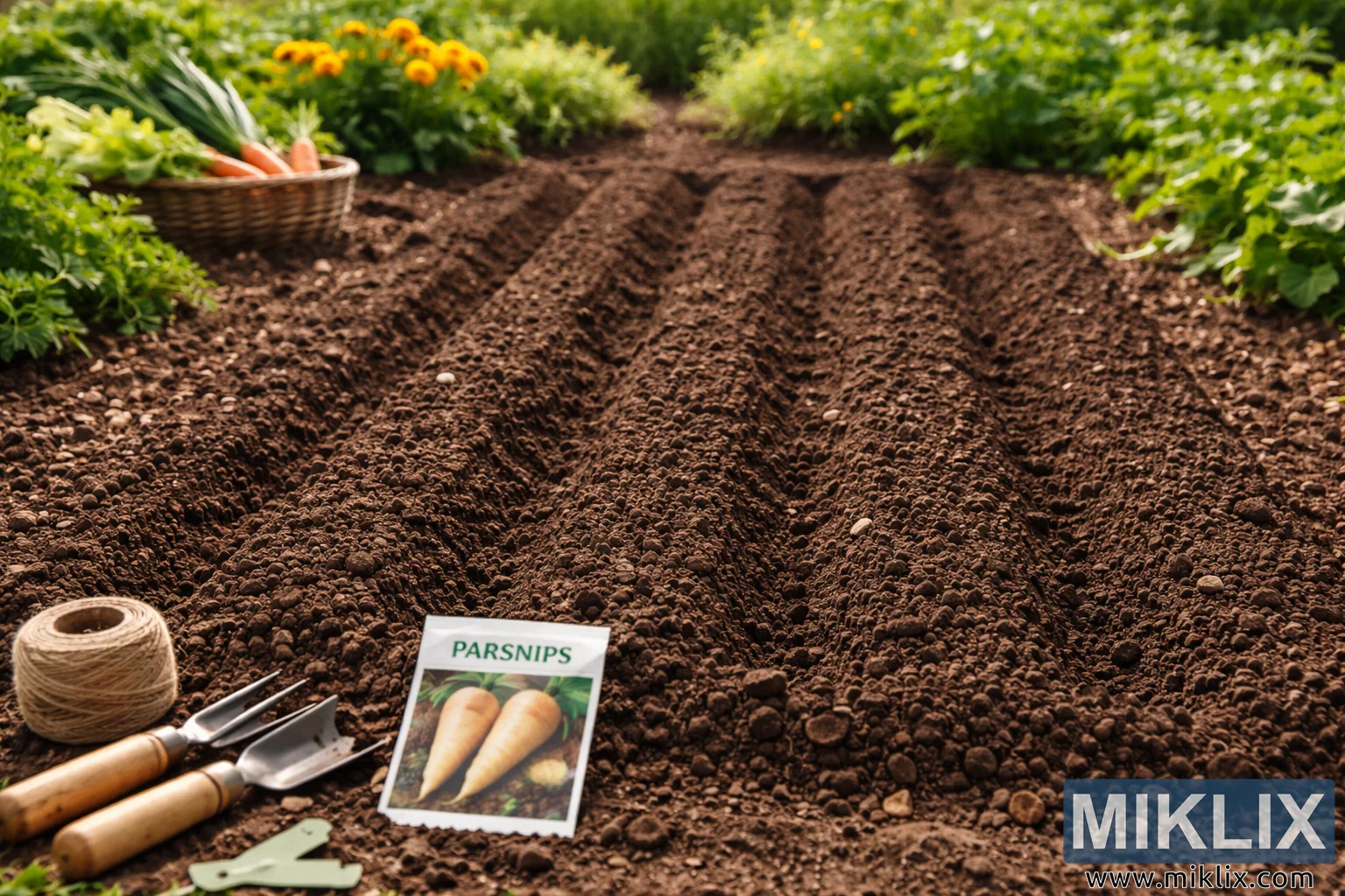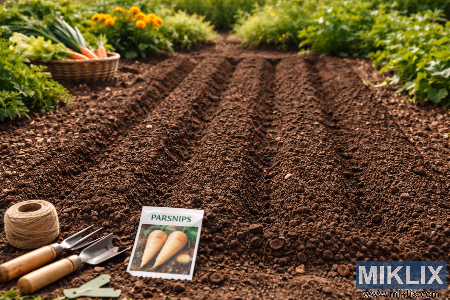 A well-prepared vegetable garden bed with rich dark soil formed into planting rows, surrounded by greenery and gardening tools, ready for sowing parsnip seeds.