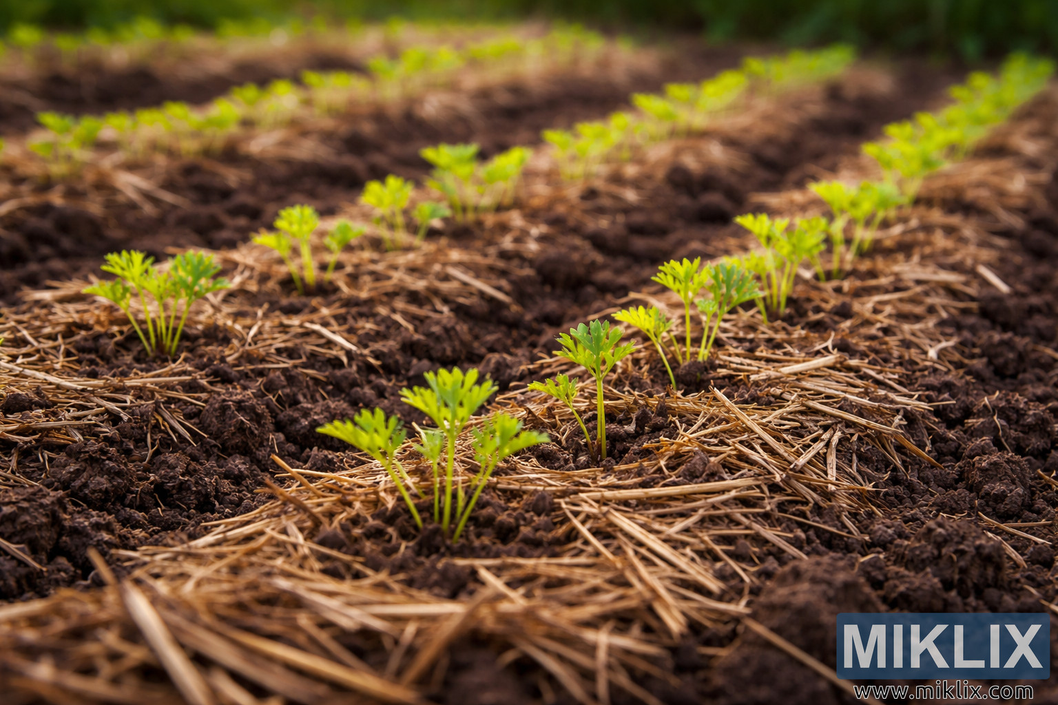 Image: Young Parsnip Seedlings Emerging in Mulched Garden Rows