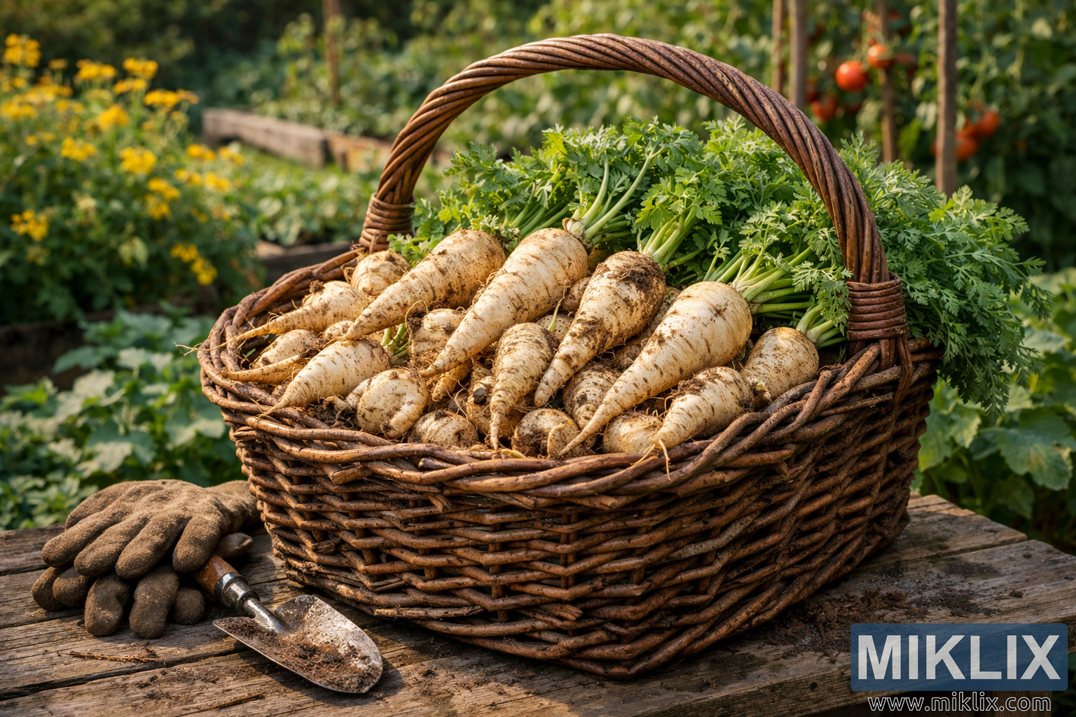 A rustic garden scene showing a wicker basket overflowing with freshly harvested parsnips on a wooden table, with garden beds and plants softly blurred in the background.