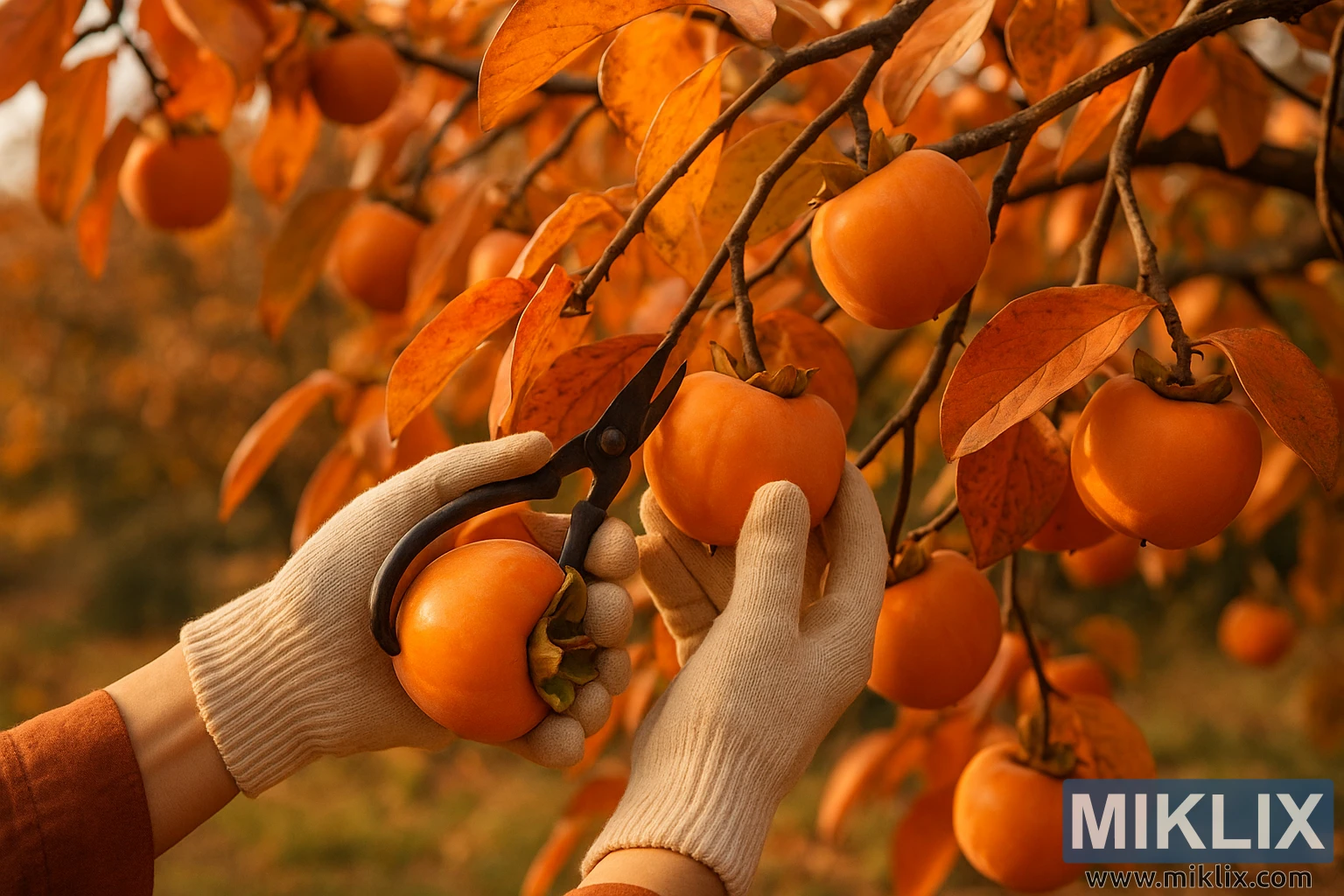 A serene autumn scene of ripe persimmons being carefully harvested from a tree, with orange fruits glowing amid golden leaves in the warm afternoon light.