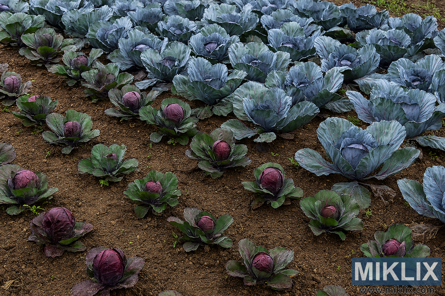 High-resolution image of red cabbage varieties growing in garden rows, showcasing size and color differences for horticultural and educational use.