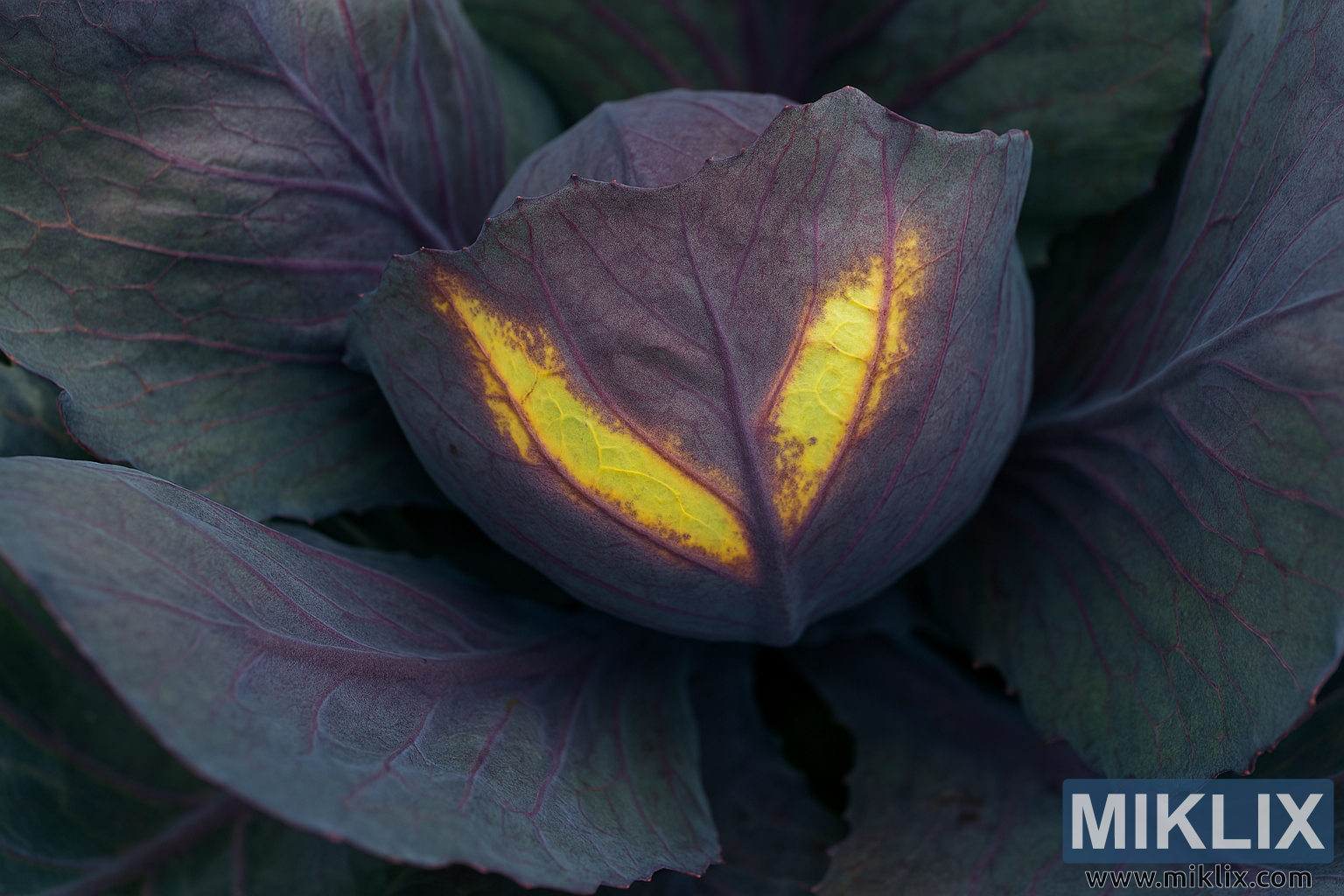 High-resolution image of red cabbage leaves displaying early signs of disease with yellow V-shaped lesions. Ideal for horticultural diagnostics and educational use.